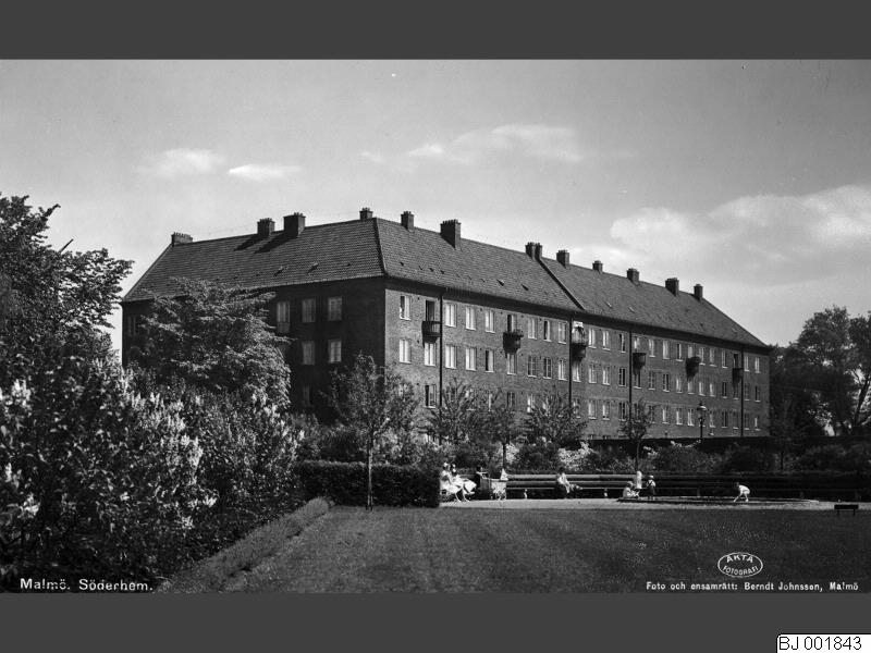 Lekplatsen på Värmlandsplan och husrad vid Flensburgsgatan 3 – 5, kv Notarien. (Södra Förstadsgatan korsar efter husen i höger kant)