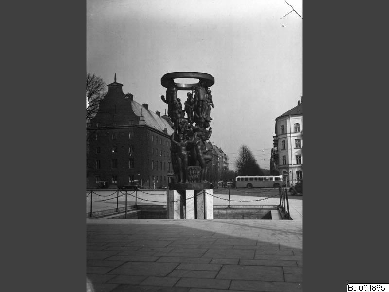Malmö. Bronsgruppen Tragos av Nils Sjögren placerad framför Stadsteatern år 1953.