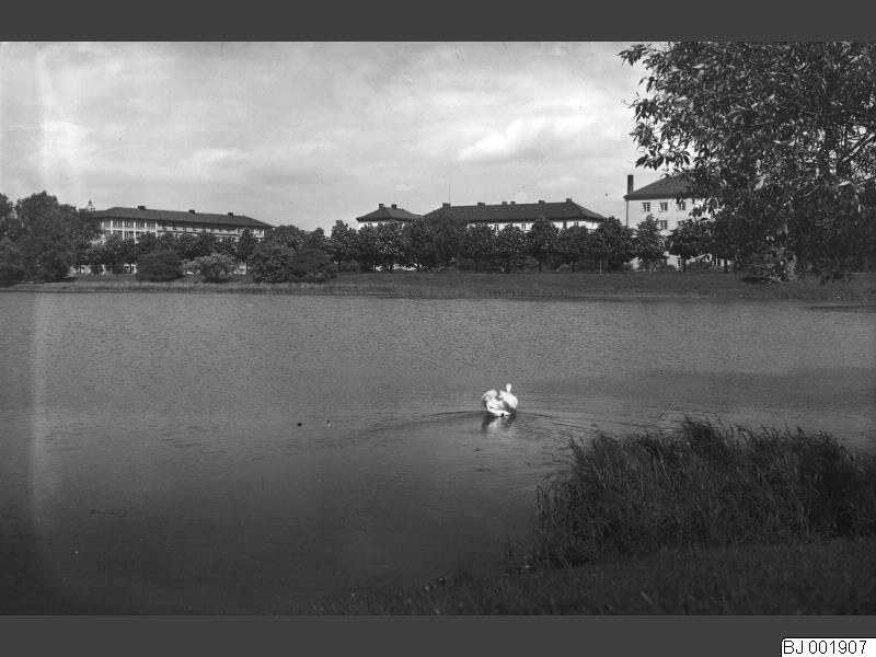 BJ 001907 :: park, damm, svan, sjukhus, träd