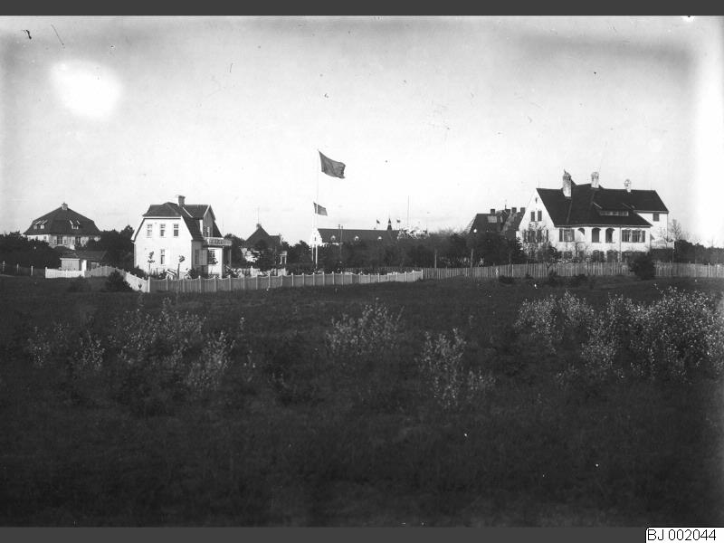 BJ 002044 :: stadsbebyggelse, flaggstång, nationalflagga, staket, skorsten