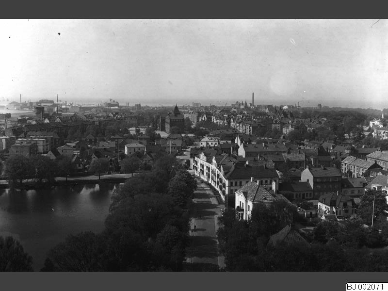 Landskrona. Vy från Gamla vattentornet mot Seminariegatan och Läroverket.