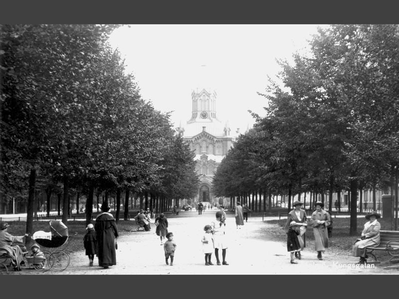stadsgata; kyrka; ur; bänk; barnvagn; barn; träd
