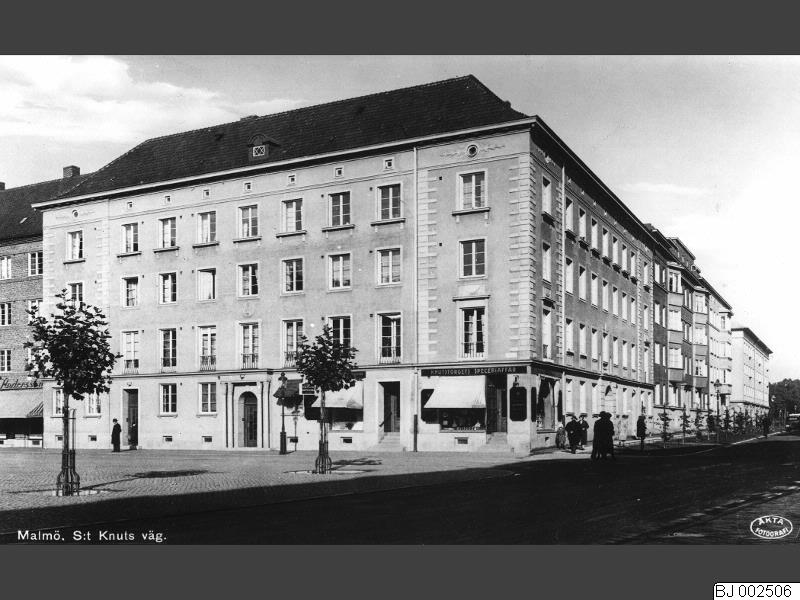 Gatubild, St. Knuts väg i Malmö Knutstorget, speceriaffär i hörnhuset