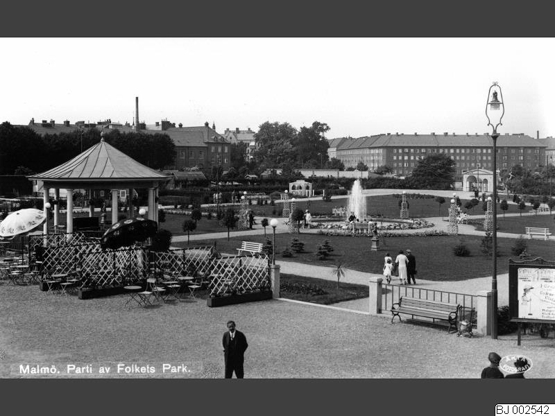 BJ 002542 :: folkpark, stadsbebyggelse, flerbostadshus, bänk, utomhusbelysning, fontän