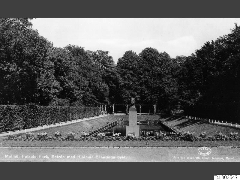 Malmö. Folkets Park. Hjalmar Brantings byst sedd från Gamla entrén.