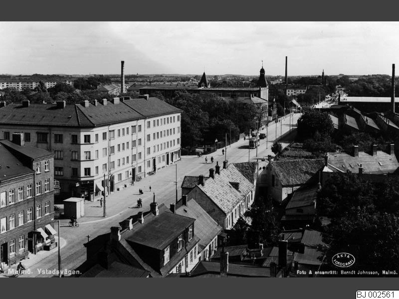 - Södervärn. Ystadvägen på 1930-talet eller möjligen år 1940. Spårvagnslinje 2 lades ned 1936 men återupprättades periodvis under de första krigsåren på grund av den minskade busstrafiken. I bakgrunden Kürzels Spinneri och Malmö Läderfabrik.