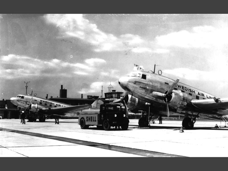 - Bulltofta sommaren 1946. ABA:s bägge DC-3:or SE-BAT "Tranan" och SE-BAW "Svanen". En tankbil från SHELL förser "Svanen" med bränsle. Planen övergick till SAS 1948 och var i tjänst till 1951 respektive 1950. Planens namn när de flög för SAS var "Torsten Viking" och "Vidar Viking".