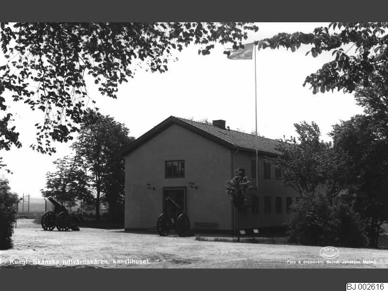 Kungliga Skånska Luftvärnskåren, kanslihuset. Två kanoner framför huset