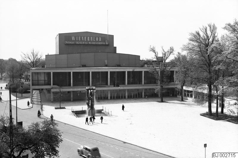 - Malmö. Stadsteatern och Nils Sjögrens fontänskulptur Tragedins födelse. På reportoaren Wienerblod och Hjälten på den gröna ön, vilka spelades på Stora scenen och på Intiman våren 1953.
