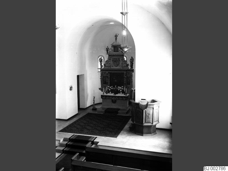 BJ 002786 :: kyrka, kyrkointeriör, altare, altartavla, kyrkoskulptur, ljusstake, ljuskrona, predikstol, kyrkbänk