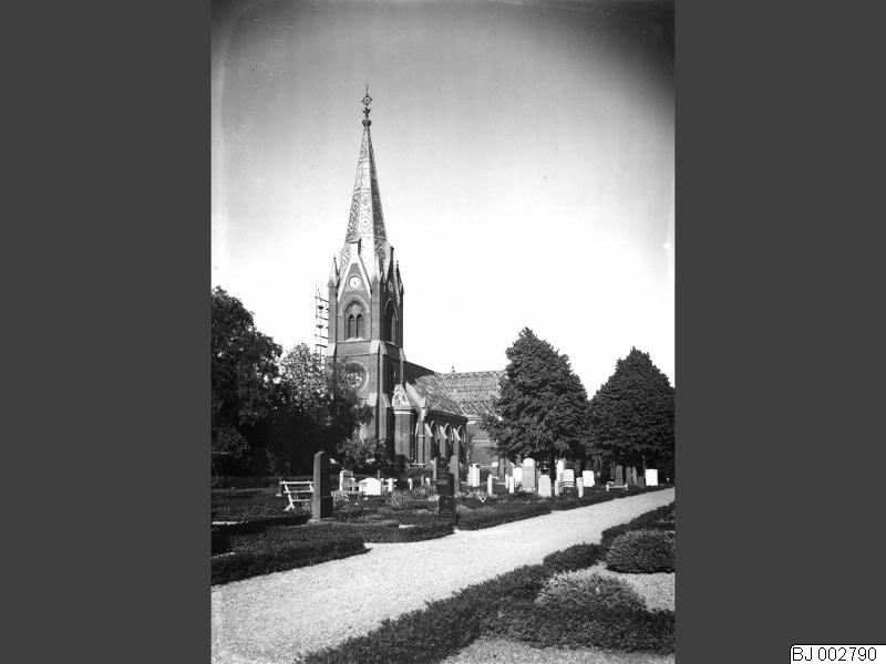 BJ 002790 :: kyrka, kyrkogård, gravsten, ur, träd
