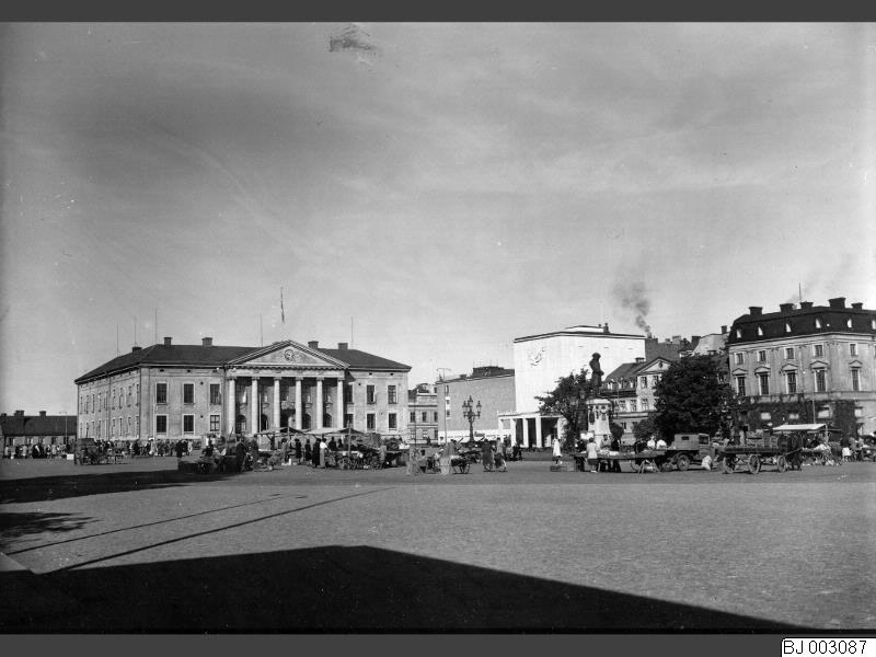 torg; rådhus; teater; torghandel; häst; vagn; staty; skulptur; lastbil; cykel; gatubelysning; ur