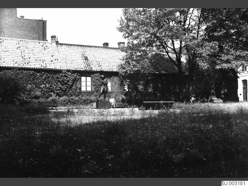Lund. Petriplatsen med Ansgar Almquists statyett av Carl von Linné.