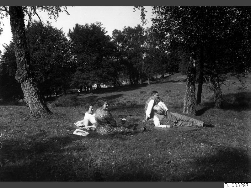 Sällskap, två kvinnor och män sittande på gräs, Önsjö härad