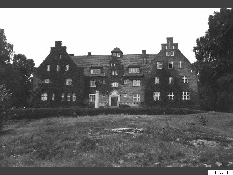 BJ 003402 :: tätortsbebyggelse, skola, skulptur, flaggstång, järnvägssamhälle