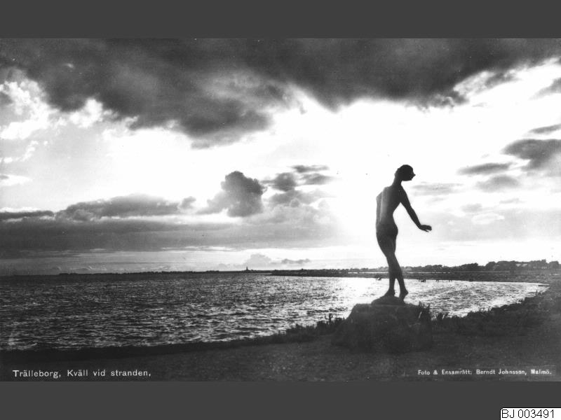 Trelleborg. Nyhamnen. Kväll vid stranden. Axel Ebbes bronsstaty Famntaget från 1930.