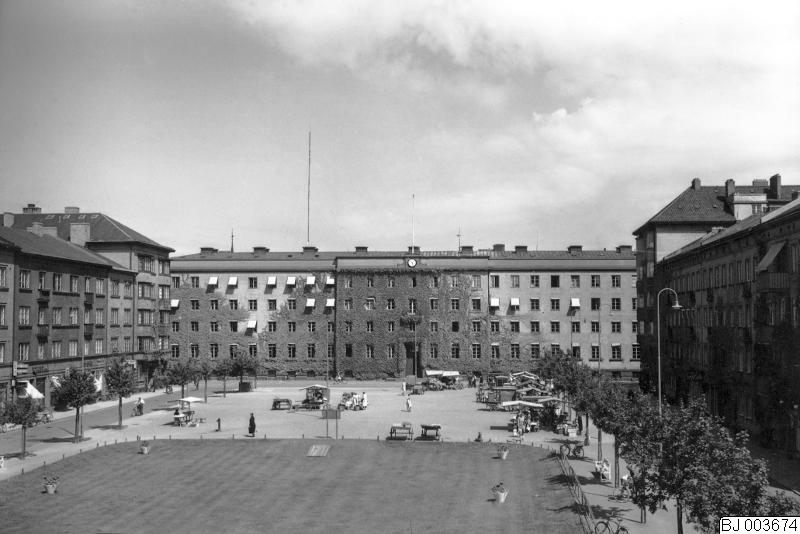BJ 003674 :: stadsbebyggelse, stadsgata, torg, torghandel, cykel, ur, träd, gatubelysning, polisstation, flerbostadshus