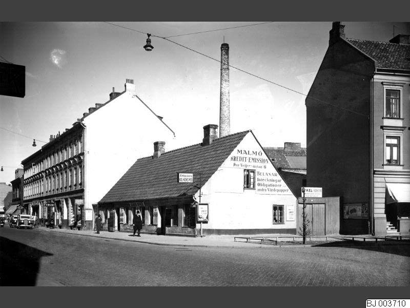 Detta är Södra Förstadsgatan - Spångatan. Triangeln i fonden.I detta kvarter låg en industri. Sett ett senare taget foto där kolaffären blivit en blomsteraffär och där fragment av den målade annonseringen på husväggen finns kvar bakom en affischtavla.