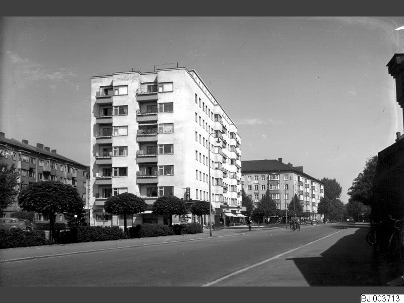 BJ 003713 :: stadsbebyggelse, stadsgata, flerbostadshus, balkong, bil, cykel, vägmärke, frisersalong, träd, gatubelysning, bilparkering