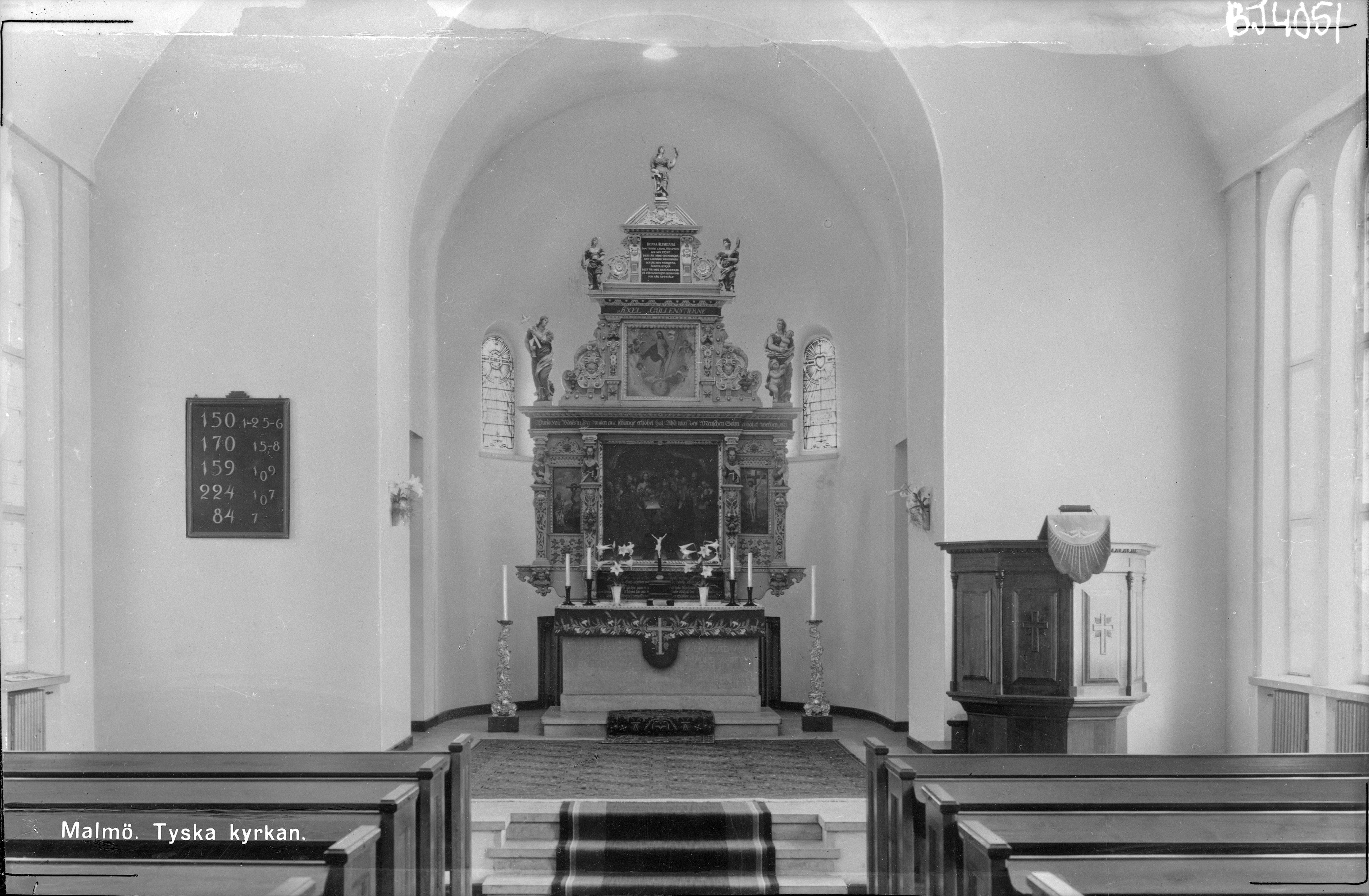 BJ 004051 :: kyrka, kyrkointeriör, altare, altartavla, kyrkoskulptur, ljusstake, predikstol, kyrkbänk