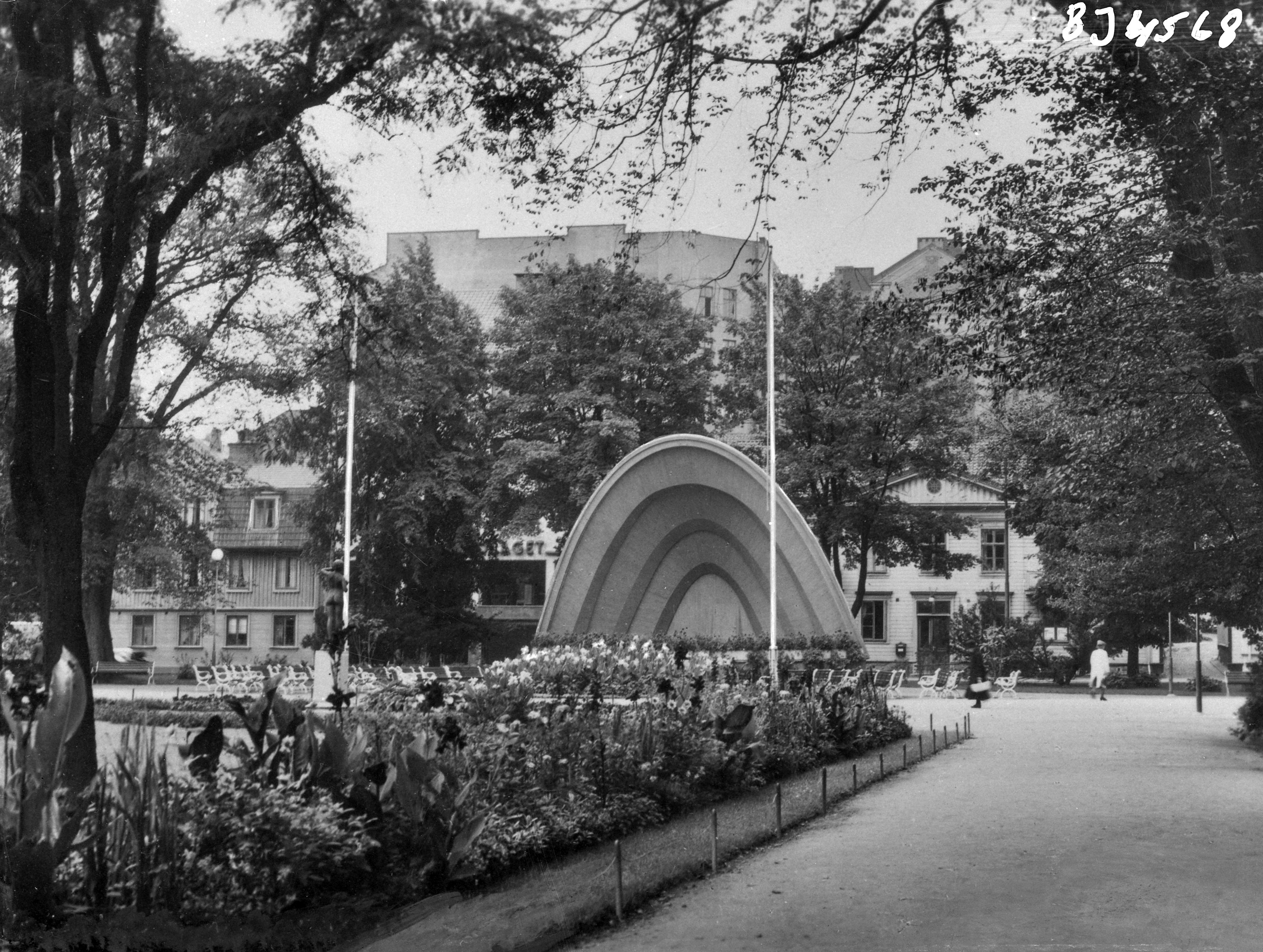 BJ 004568 :: park, musik, träd, bänk, stadsbebyggelse