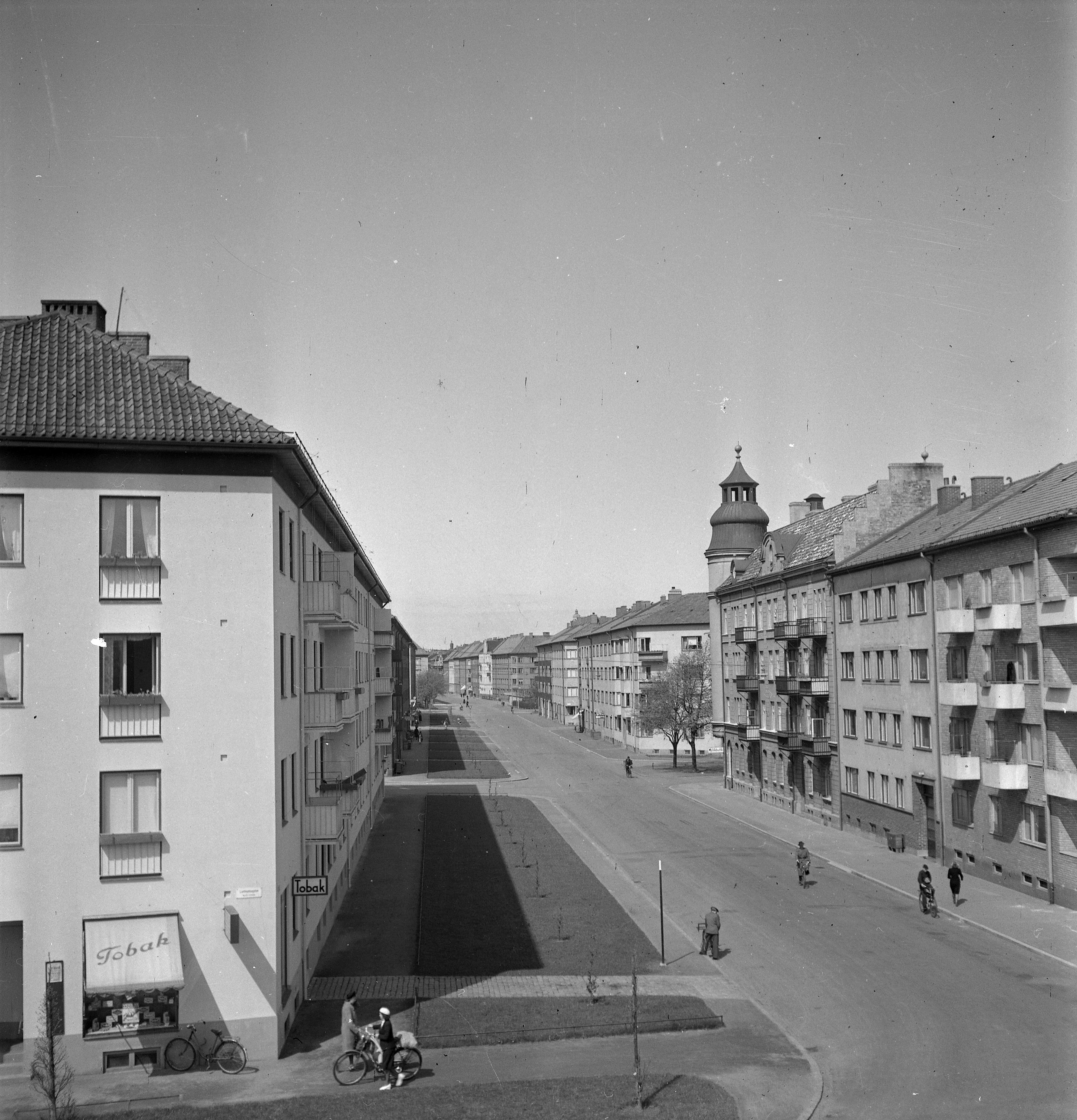 - Gata i hyreshusområde, tobaksaffär i förgrunden. Ystadsgatan västerut.