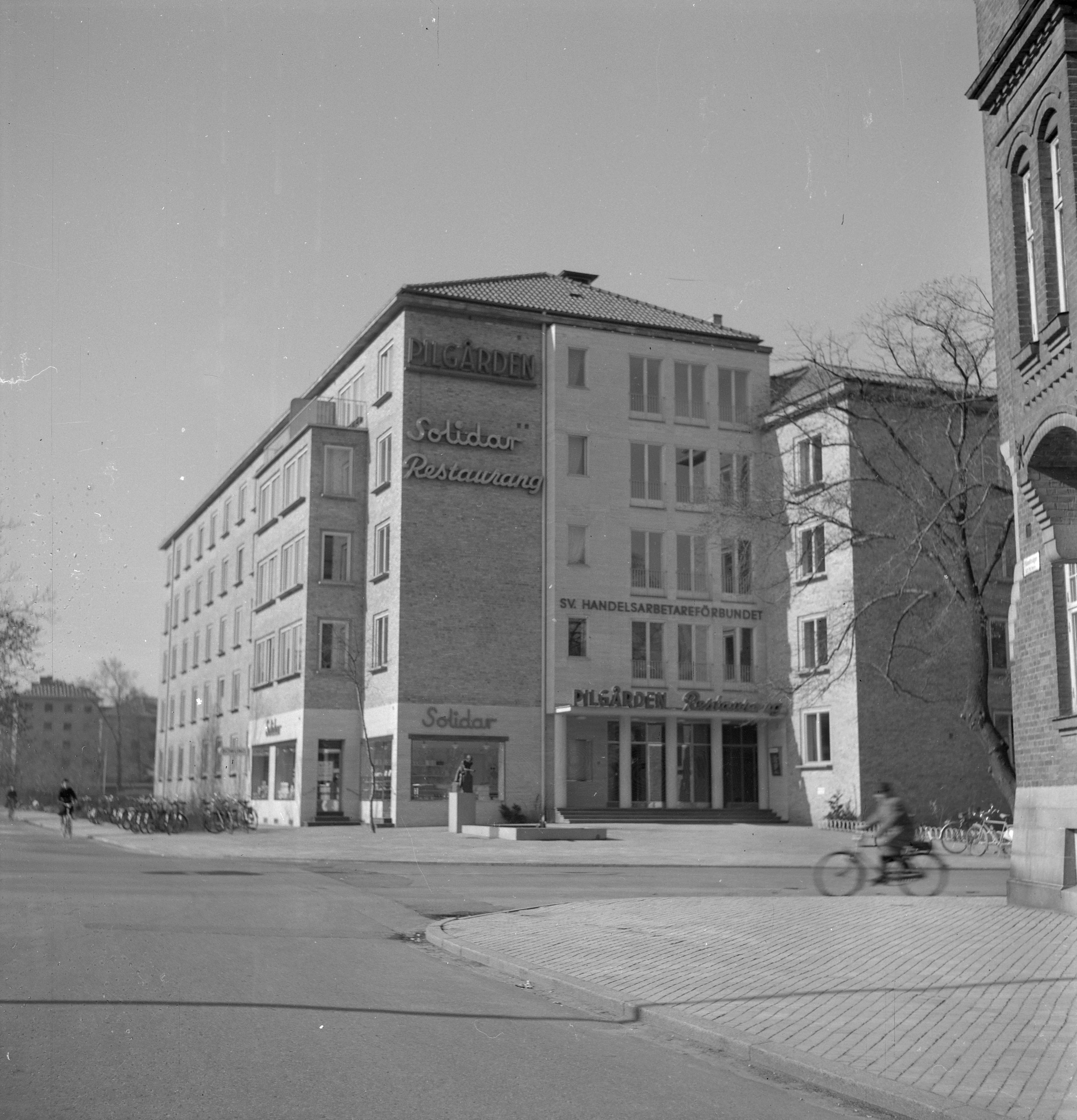 stadsbebyggelse; stadsgata; flerbostadshus; träd; skulptur; fontän; cykel; restaurang; livsmedelsaffär