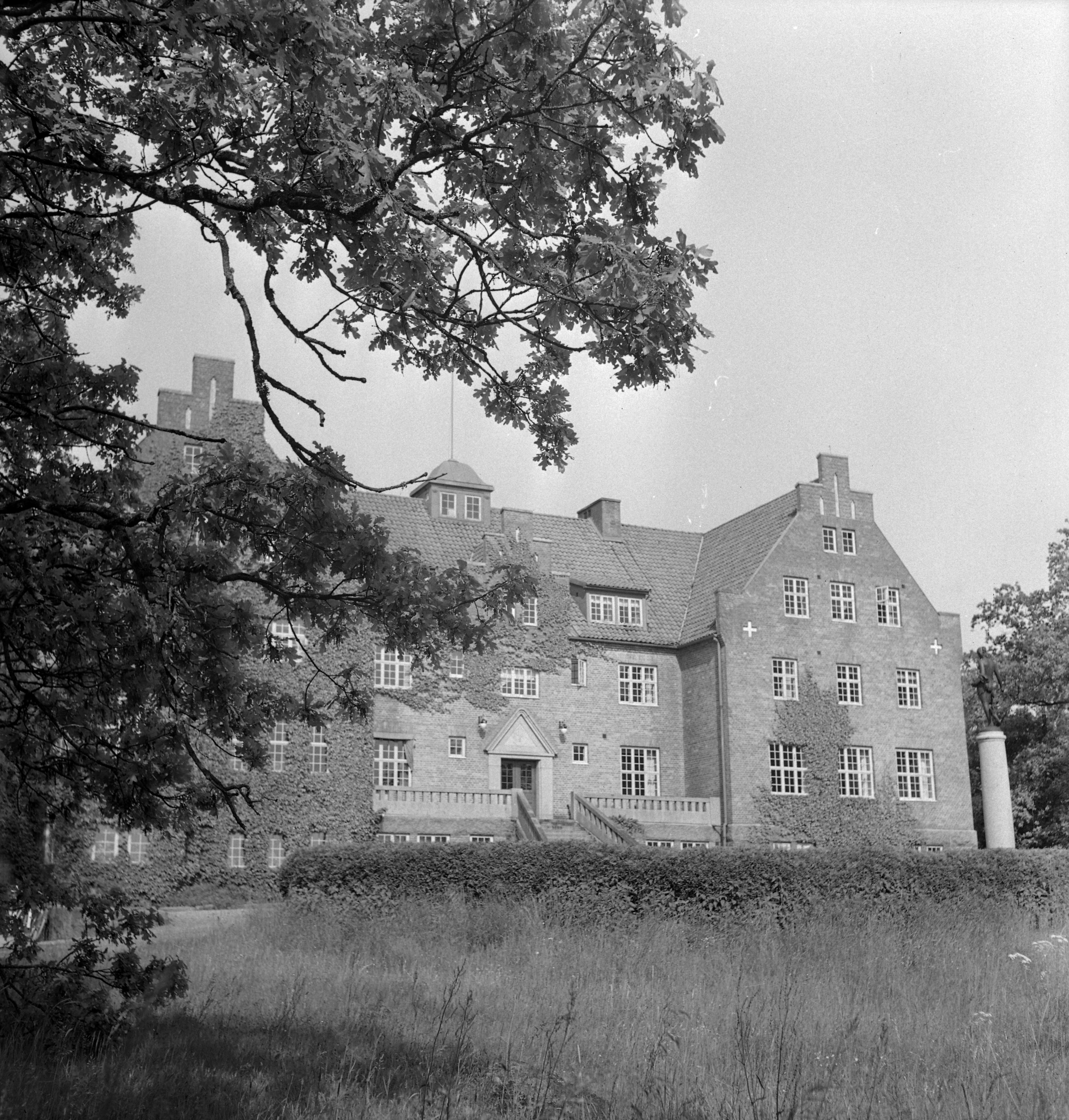 BJ 004665 :: skola, tätortsbebyggelse, järnvägssamhälle, skulptur, träd