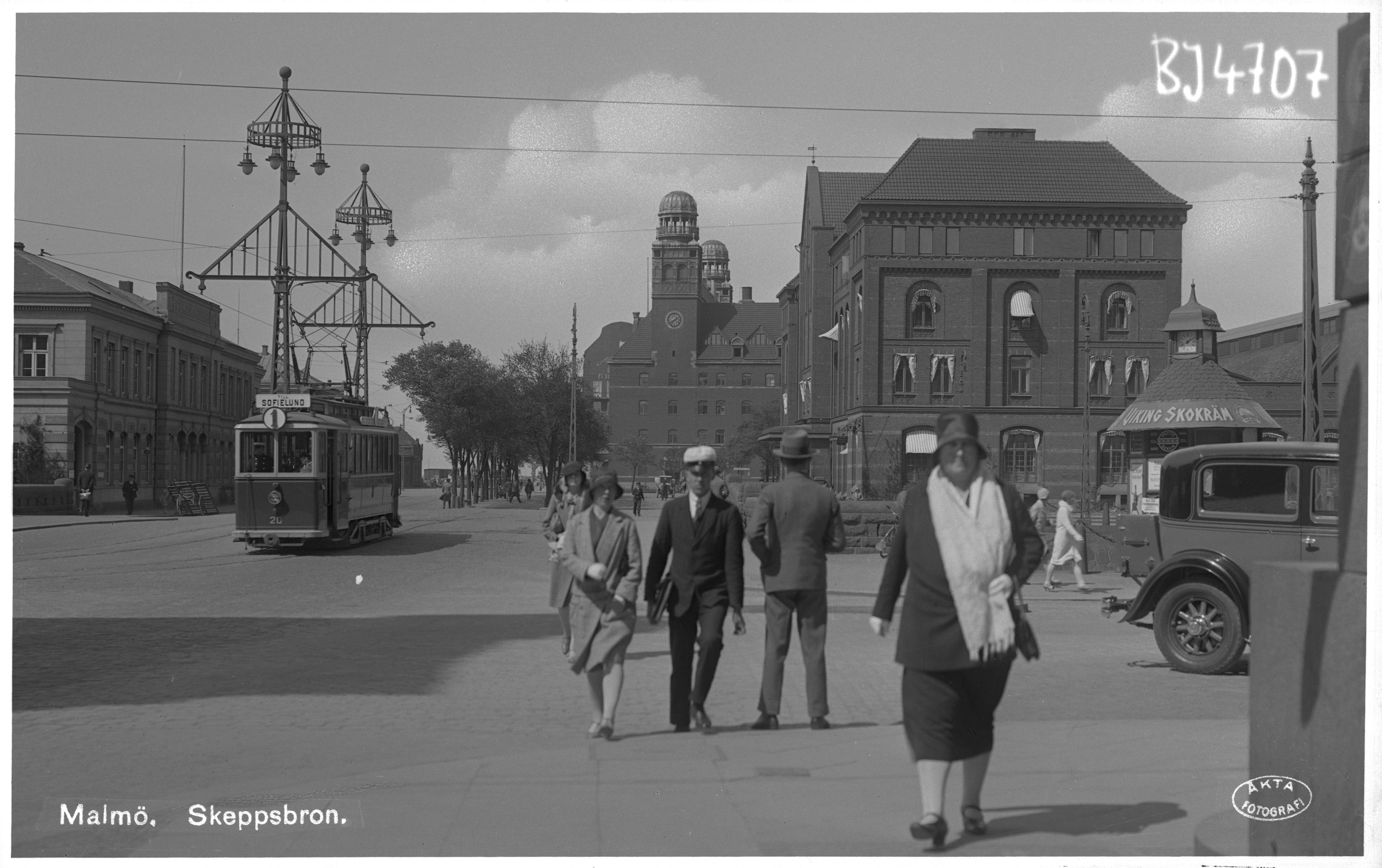 Malmö. Skeppsbron. Posthuset i bakgrunden. Spårvagn linje 1 på väg mot Sofielund.