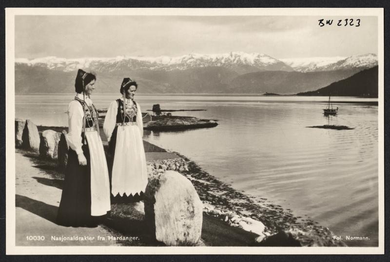 Två kvinnor i nationaldräkter från Hardanger, vid en sjö