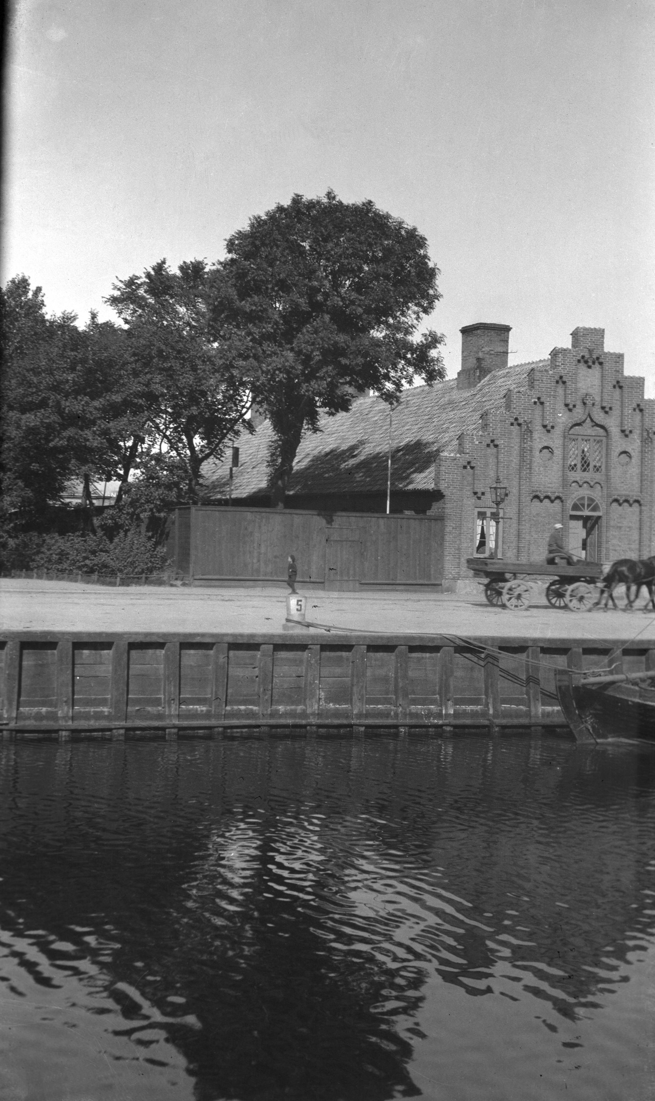 - Parti av Fiskehamnsgatan med Västra hamnkanalen i förgrunden, 1906. Väktarhuset uppfört 1851.
