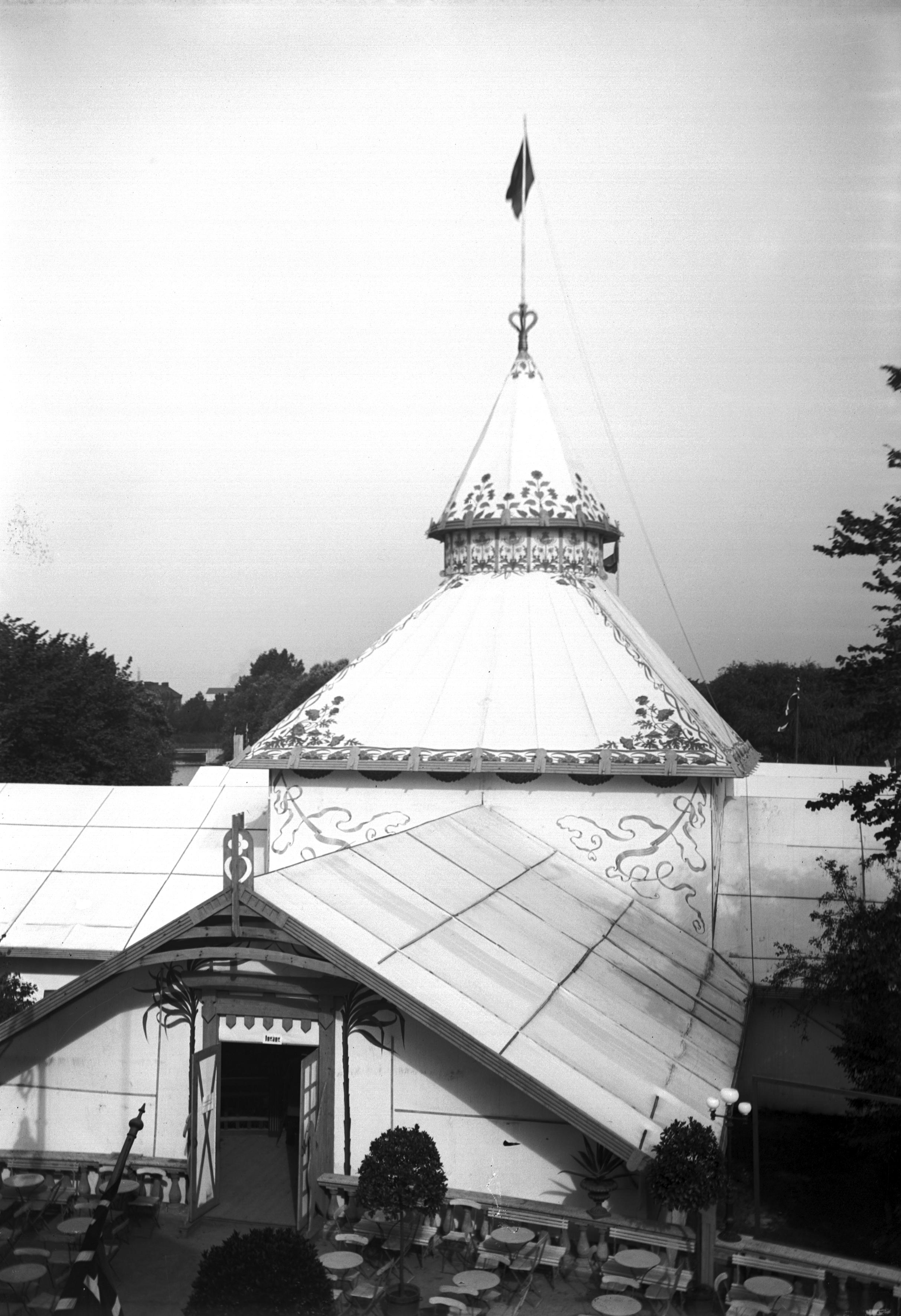 Ingång till Trädgårdsutställningen i Kungsparken, ingång till utställningen från restaurangens terass. 1901. Byggmästare Wahlberg