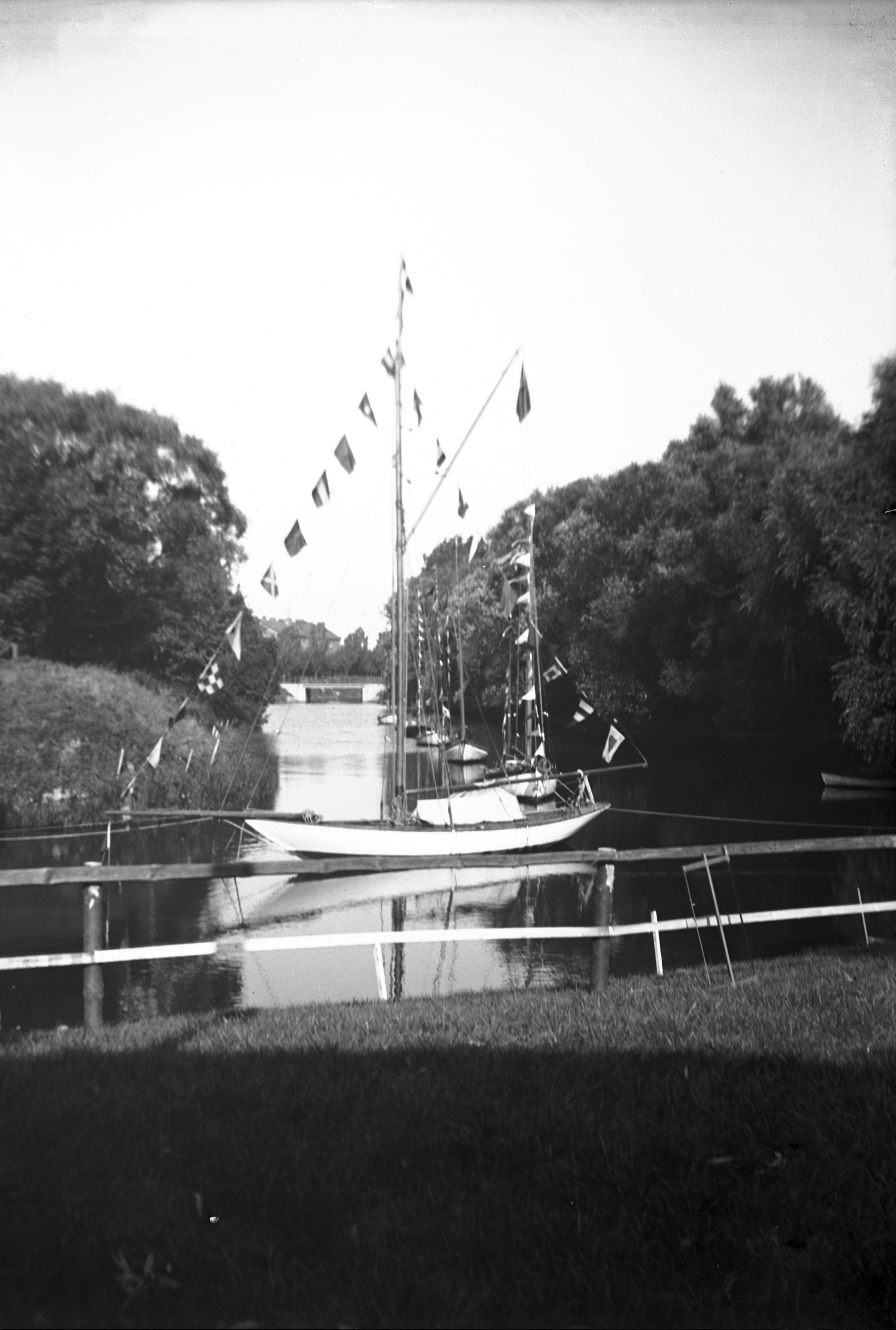 Trädgårdsutställningen i Kungsparken. Kuttern Gloriana flaggprydd i Parkkanalen med anledning av utställningen. 1901.
