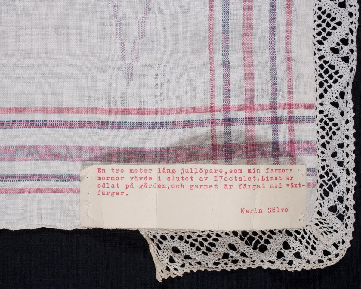 Br. 2,8 cm. Invävd märkning: ELD. 20 varp och 18 inslagstrådar per cm.