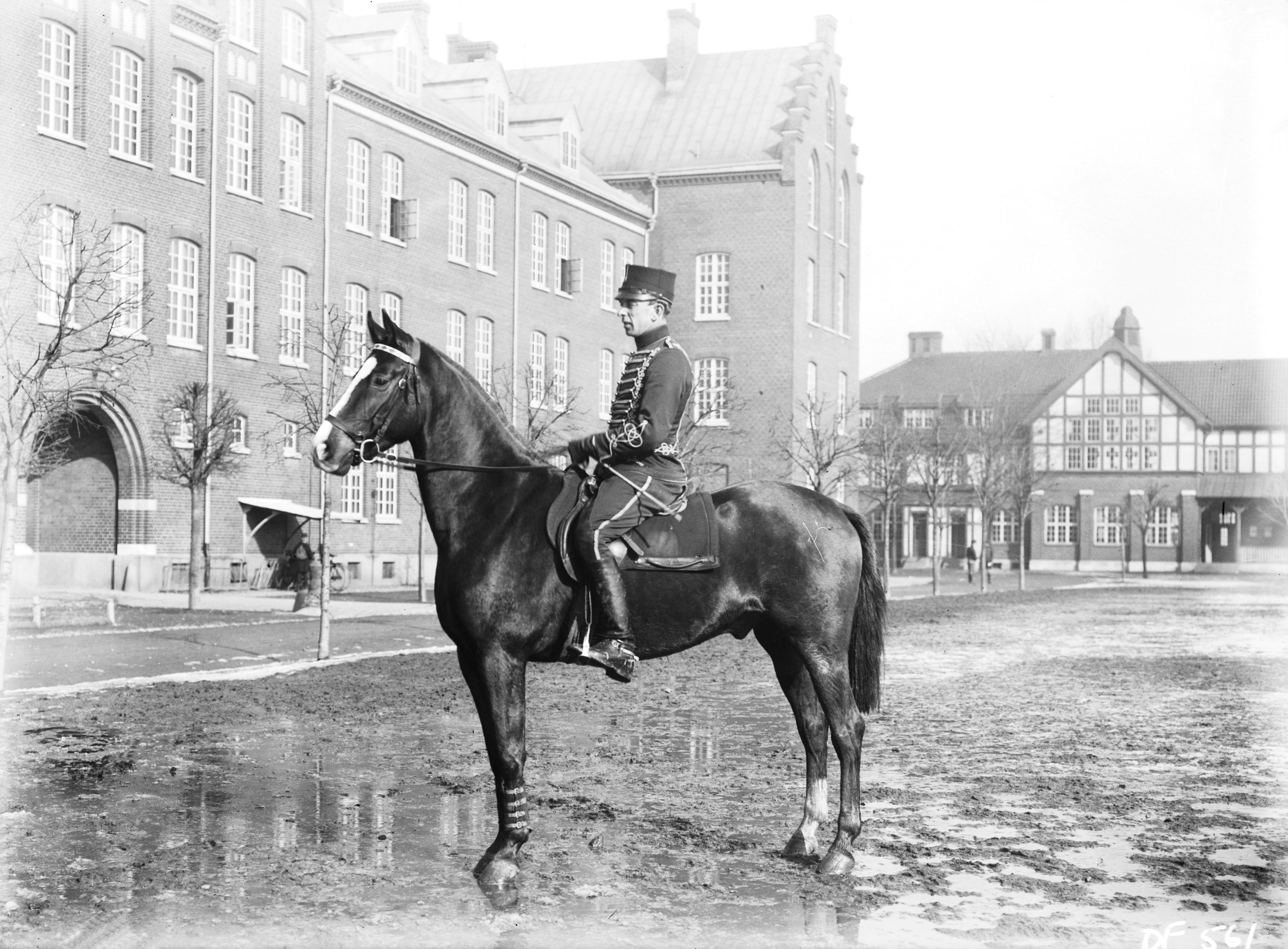 Sergant Rudolf Petterson till häst på kaserngården