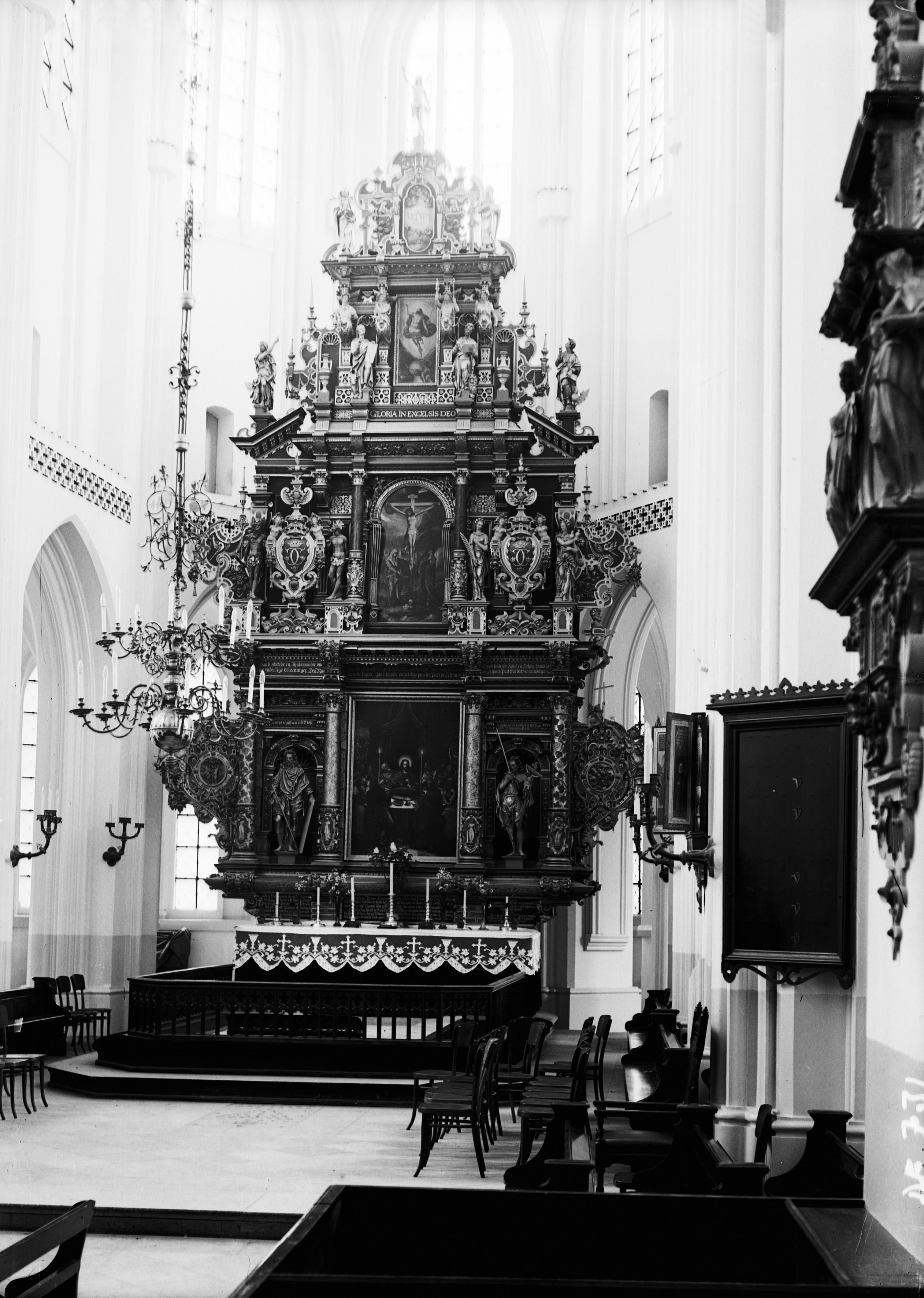 kyrka; kyrkointeriör; altare; altarduk; altartavla; kyrkoskulptur; ljuskrona; kyrkbänk; epitafium; ljusstake