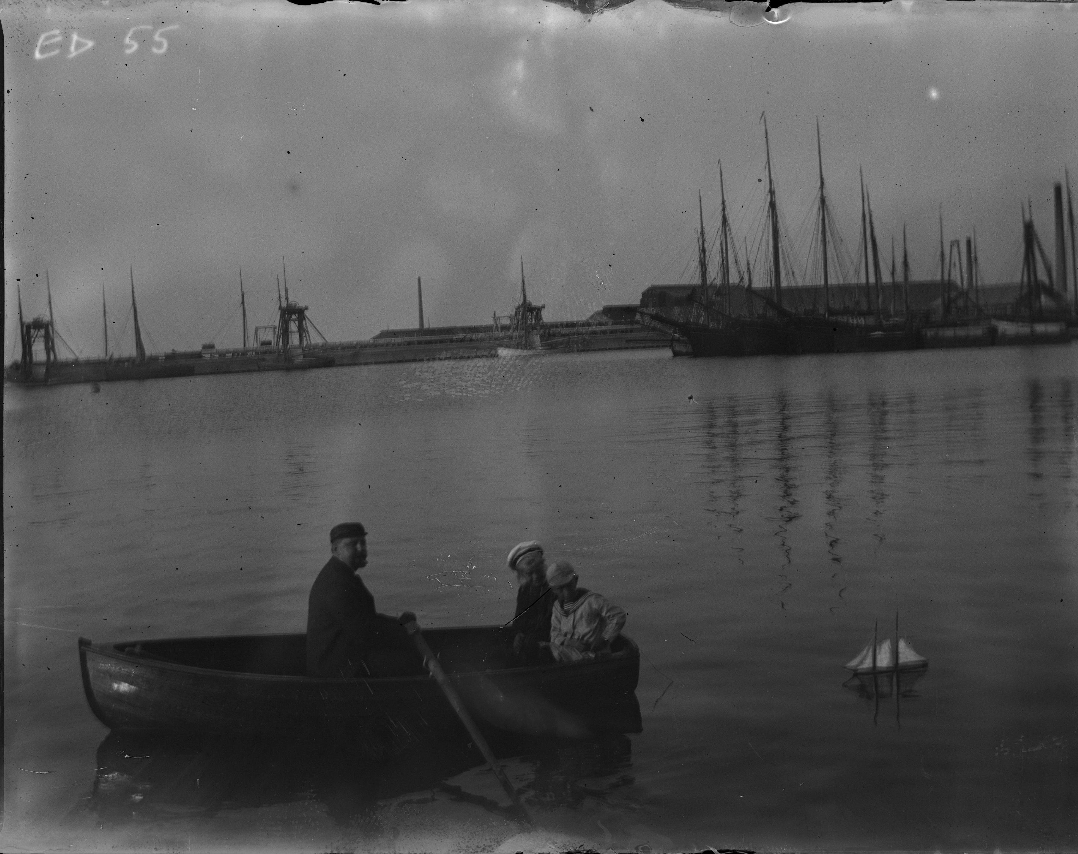 - Viggo Lassen och barn i en roddbåt med en leksaksbåt på släp i hamnen.