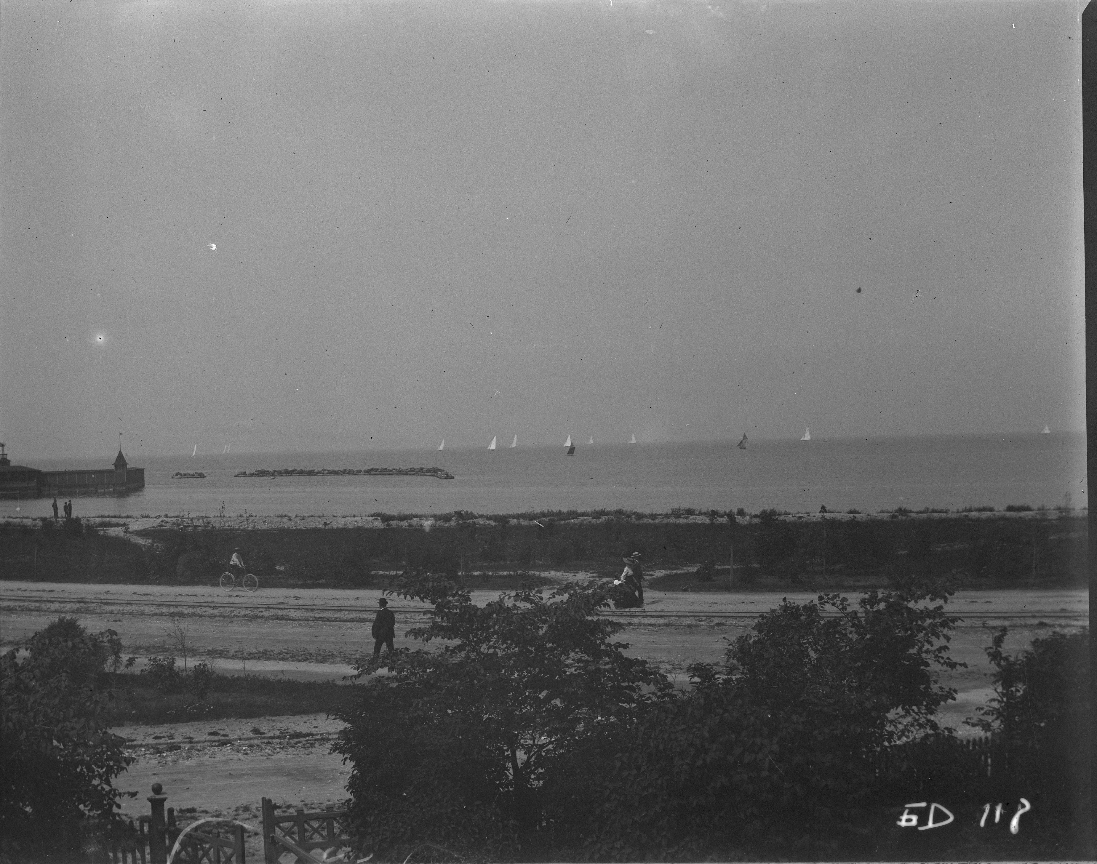 Limhamns Saltsjöbad med Limhamnsvägen i förgrunden och segelbåtar i bakgrunden, ca 1905