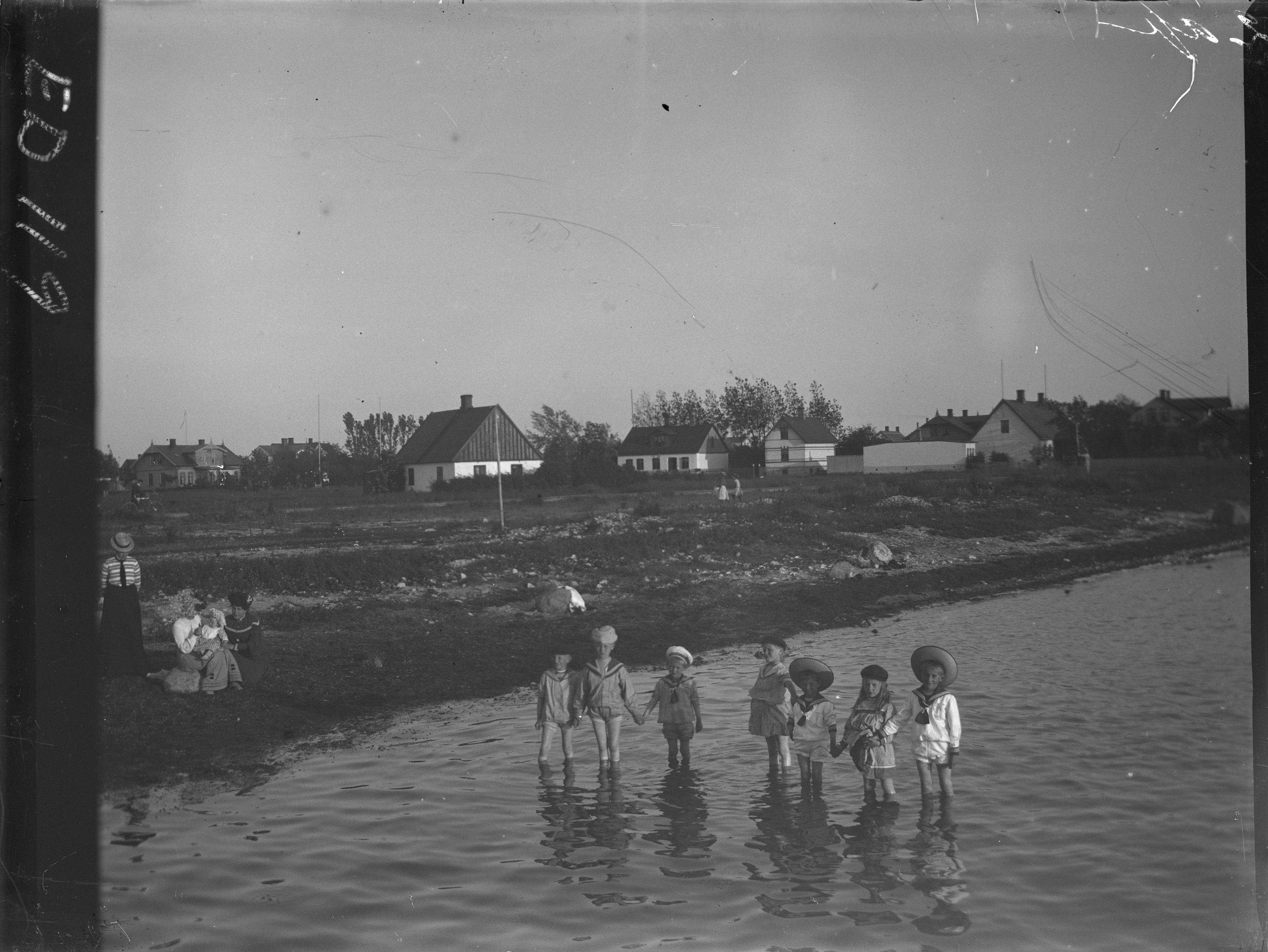 Små barn i vattenbrynet i Limhamn, villor i bakgrunden , ca 1905