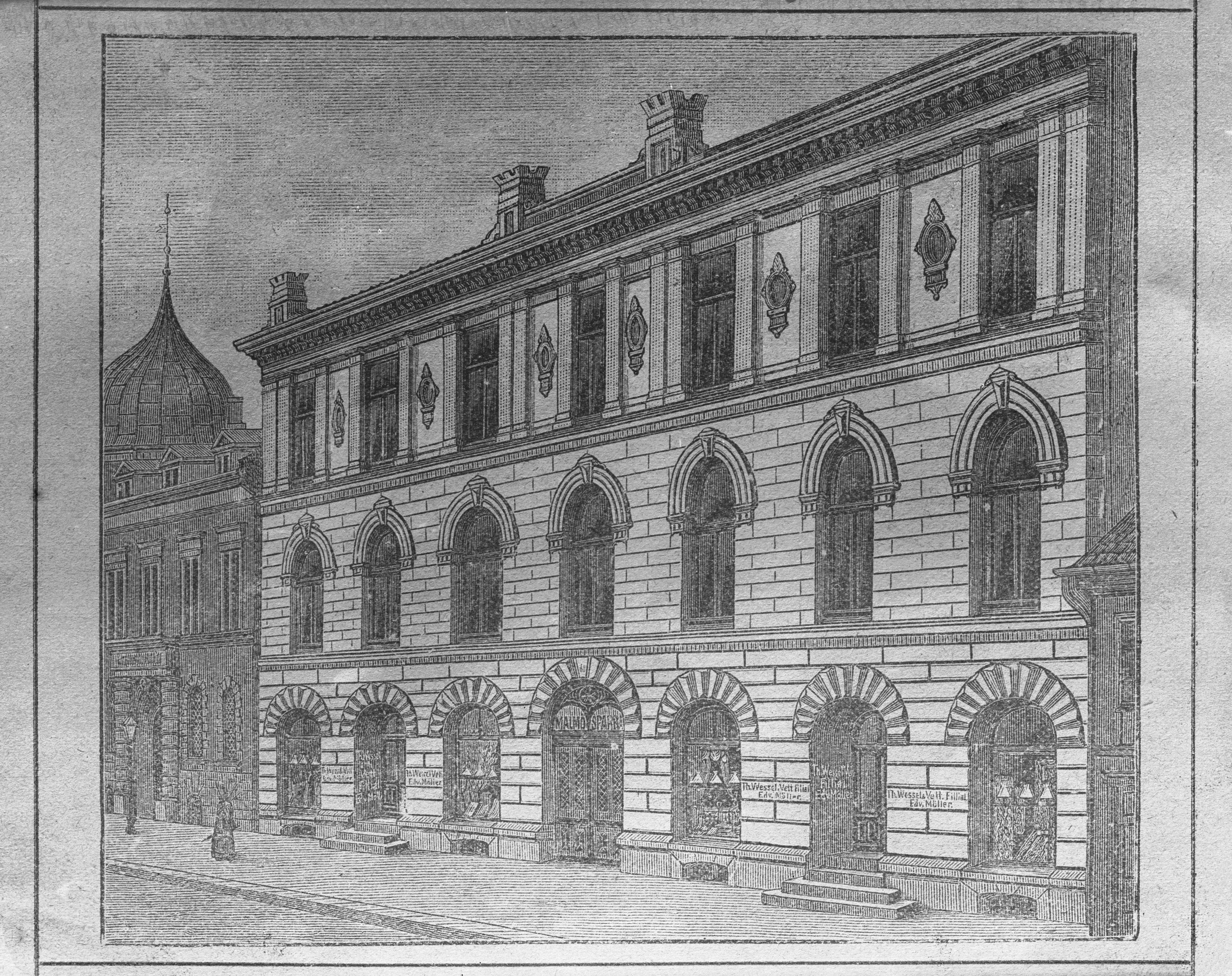 Malmö Sparbank uppförde sin nya byggnad på platsen där tidigare Kronomagasinet stått i hörnan Larmgatan/Adelgatan med då adressnr. 44. som gällde till 1913 då nya ordningsnummer gavs. I bottenvåningen på teckningen huserar danska firman "Th. Wessel & Wett" som är en filial och förestås av Edvard Möller.