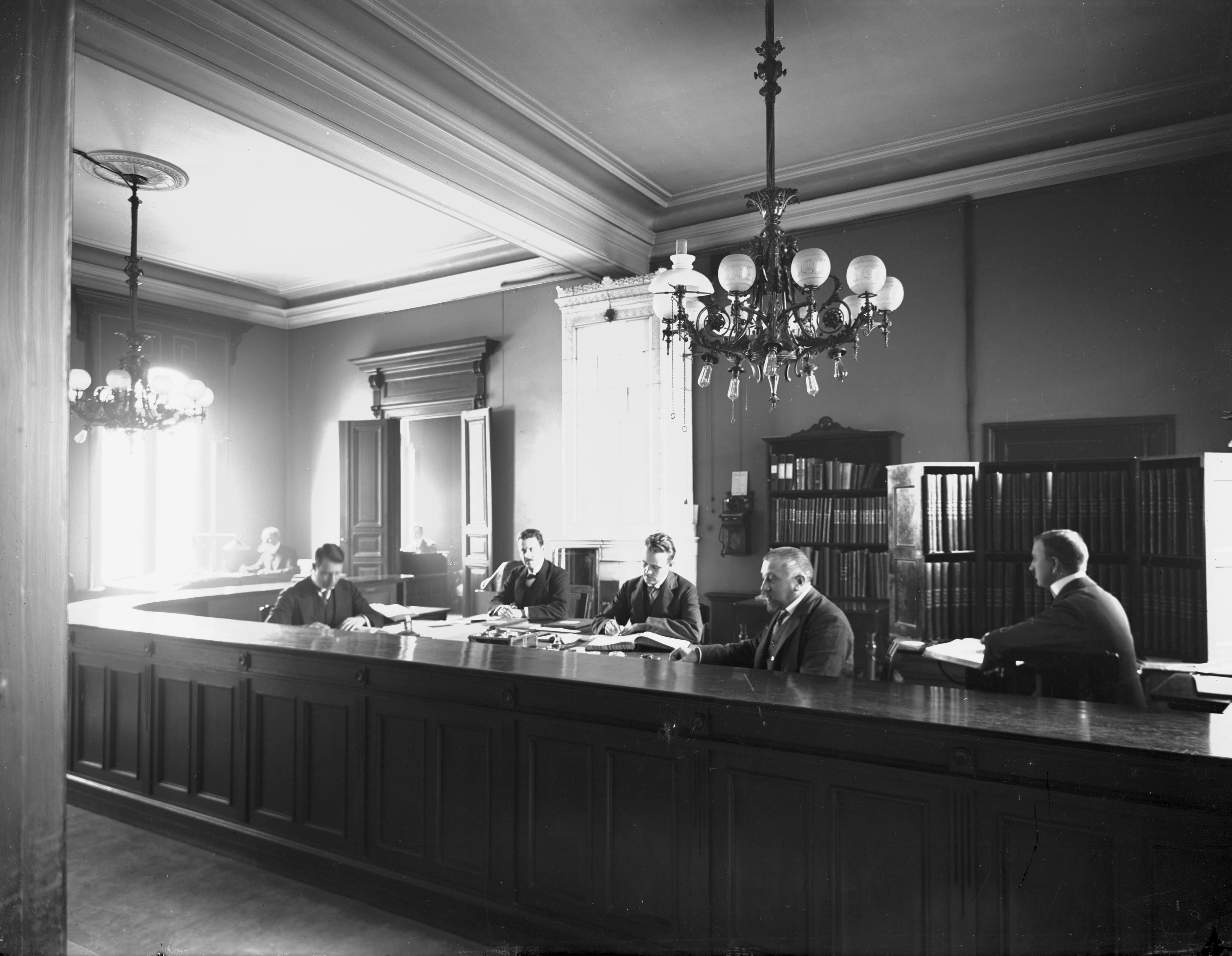 EF 000187 :: bank, bankdisk, bankpersonal, inomhusbelysning, ljuskrona, kakelugn