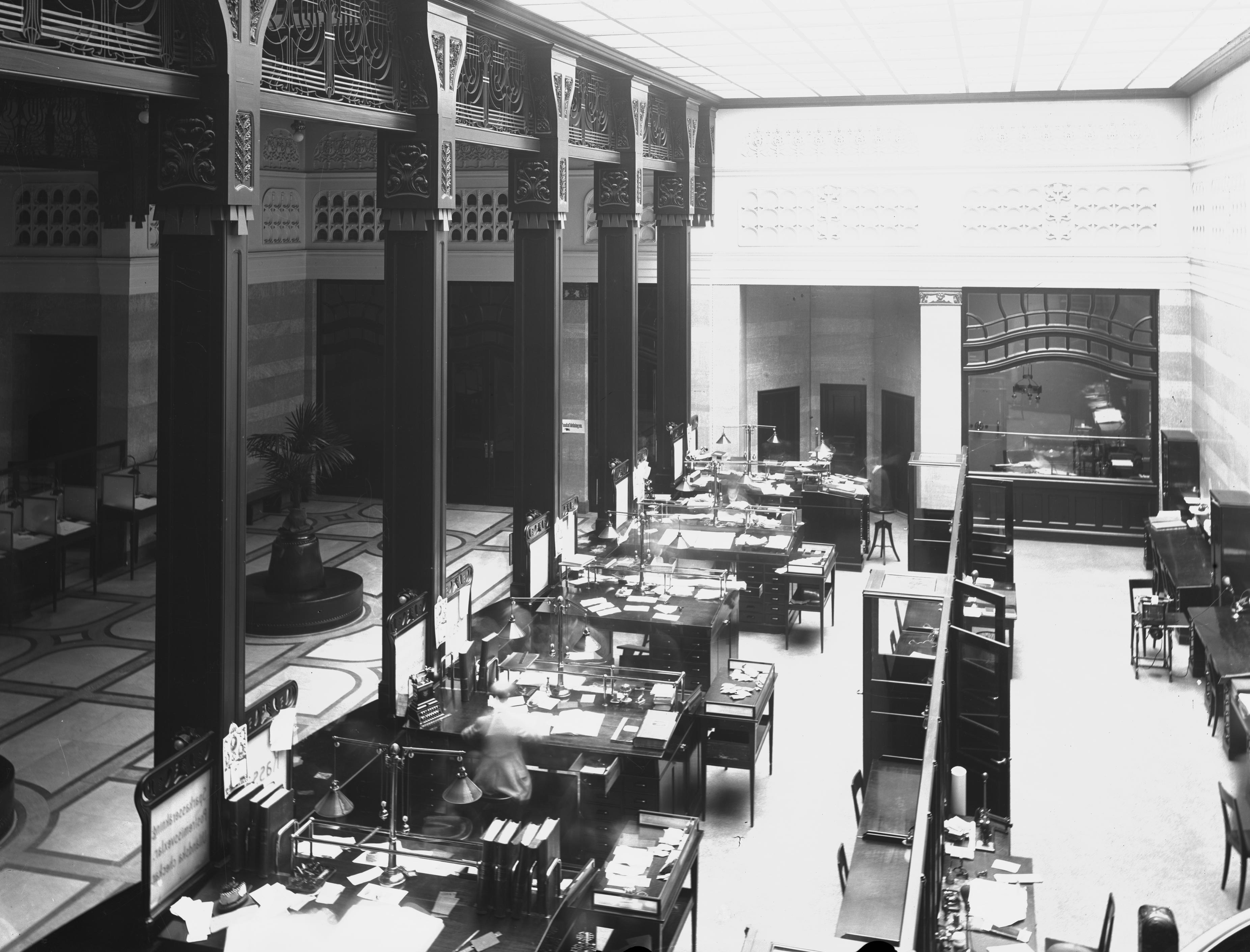 Sydsvenska Kredit AB, bankinteriör. Södergatan 10. Interör av banklokalen. 1908.