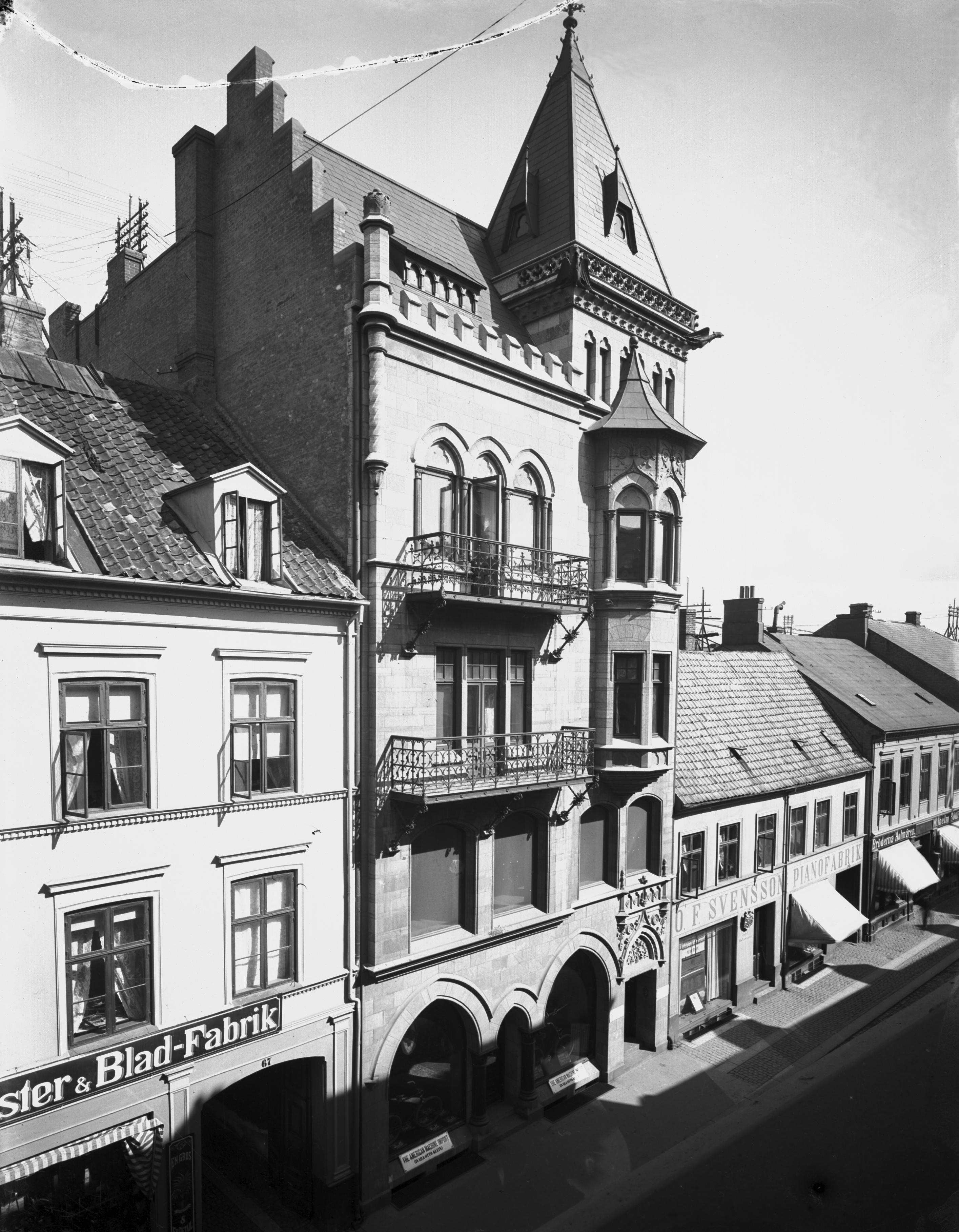 - Adelgatan, husparti på norra sidan. Fyravångingsbyggnaden uppfördes år 1897 av ingeniören vid gasverket Montgomery efter ritning av arkiteten Alfred Arwidius. "The American Machine Import" Ivar & Otto Klein.