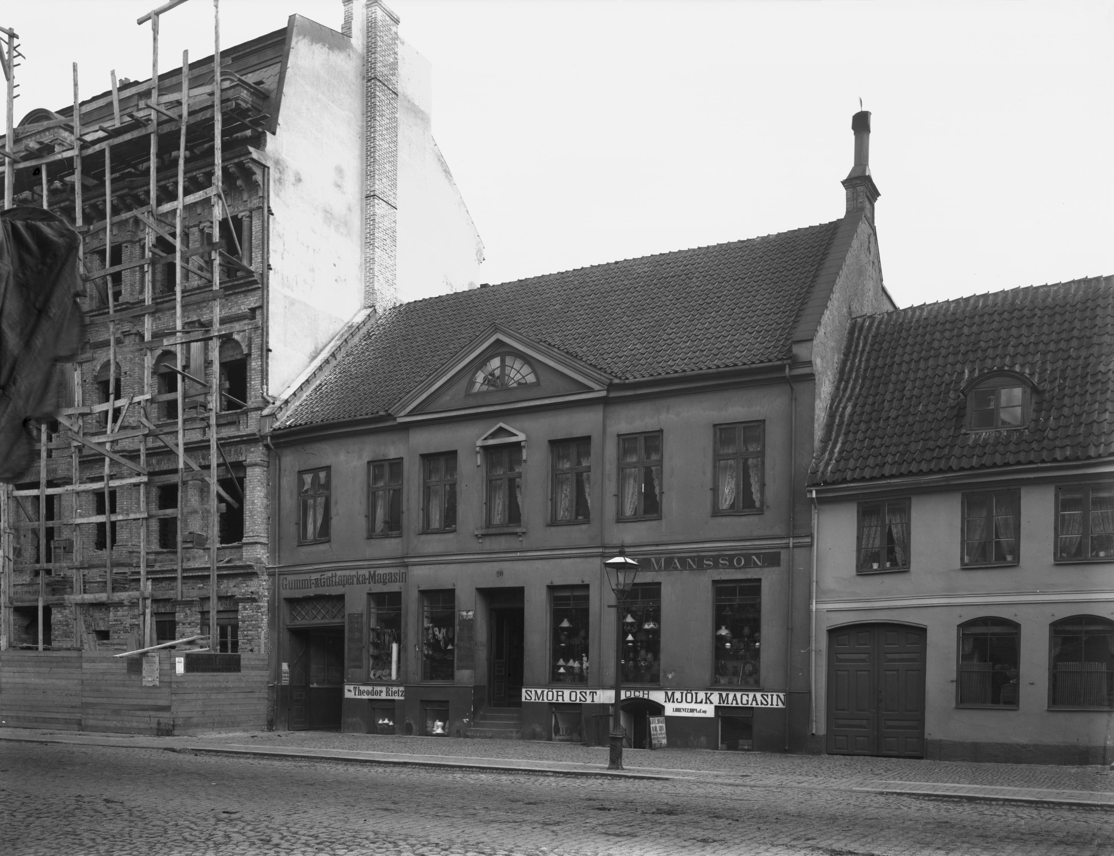 Parti av Södergatan, östra sidan med Engeströmska huset (nr 18) under byggnad, 1885. Huset revs i början av 1960-talet och kom att inrymma Roikjers firma.