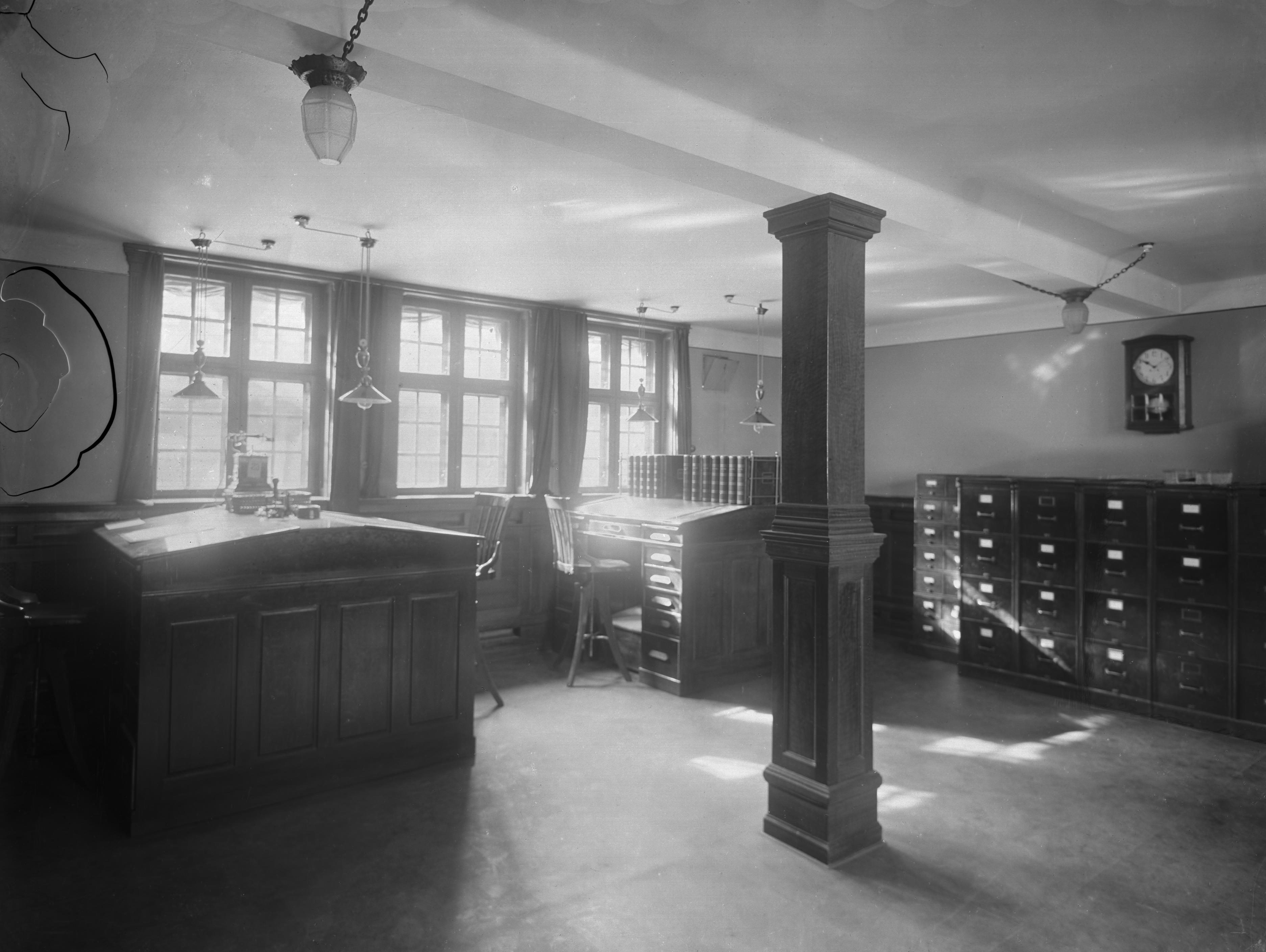 EF 000568 :: handelsgård, kontorsinteriör, ur, telefonapparat, inomhusbelysning