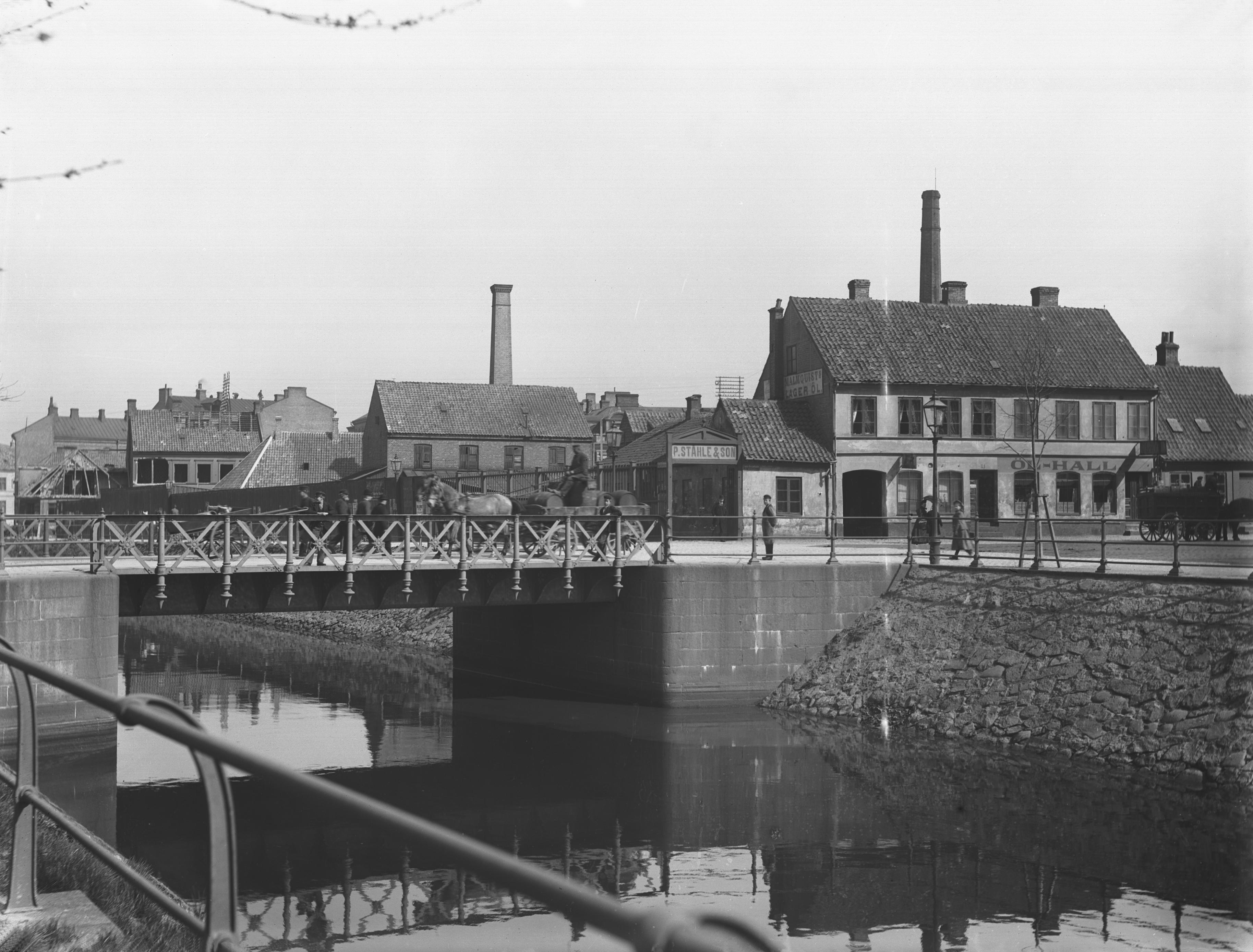 Malmqvists gamla bryggeri i hörnet av Södra Förstadsgatan och Drottninggatan med Davidshallsbron i förgrunden. Fotografen står på Södra Vallgatan.