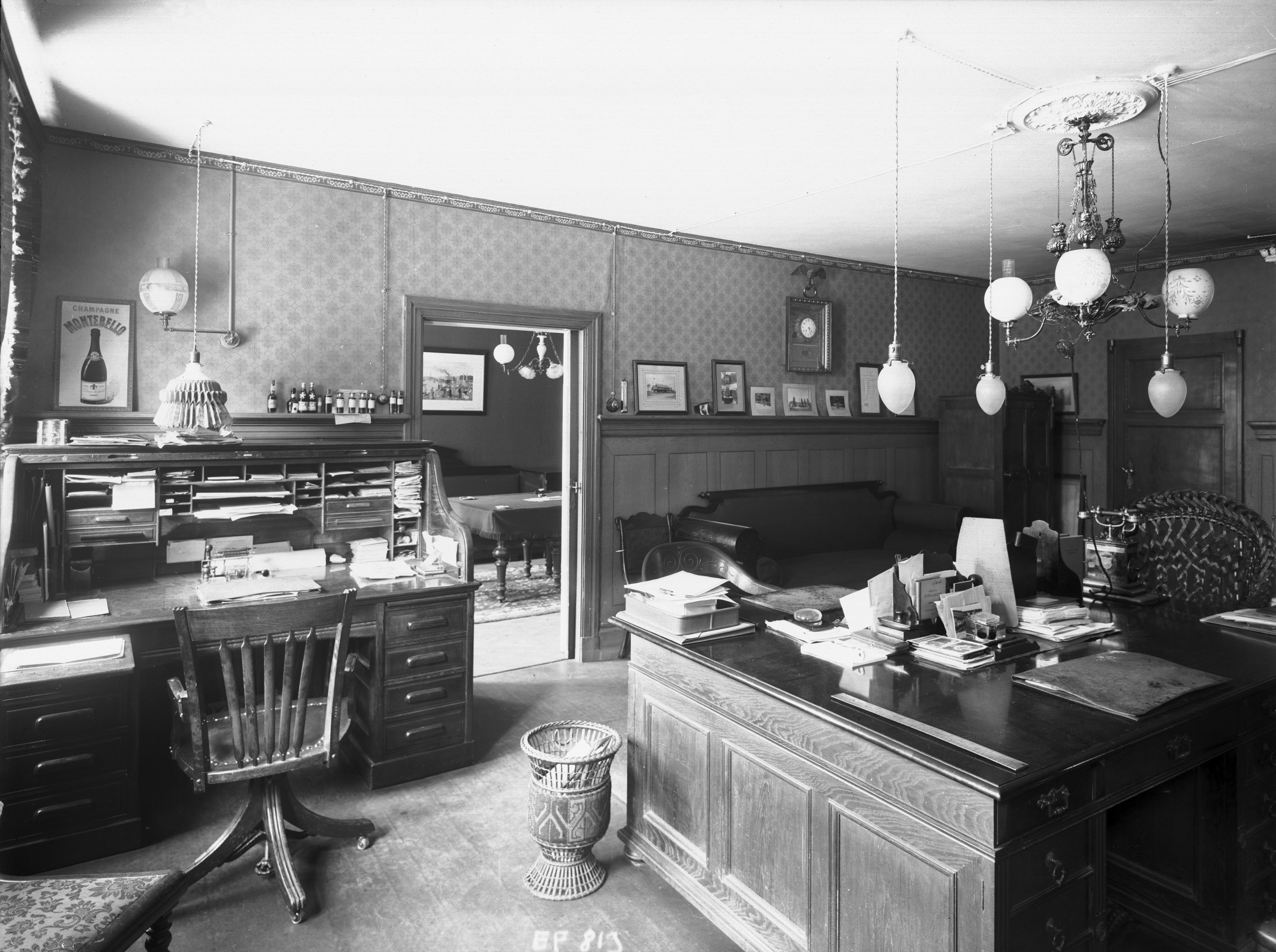 EF 000813 :: handelsgård, inomhusbelysning, telefonapparat, kontorsinteriör, korg, tapet, flaska, termometer