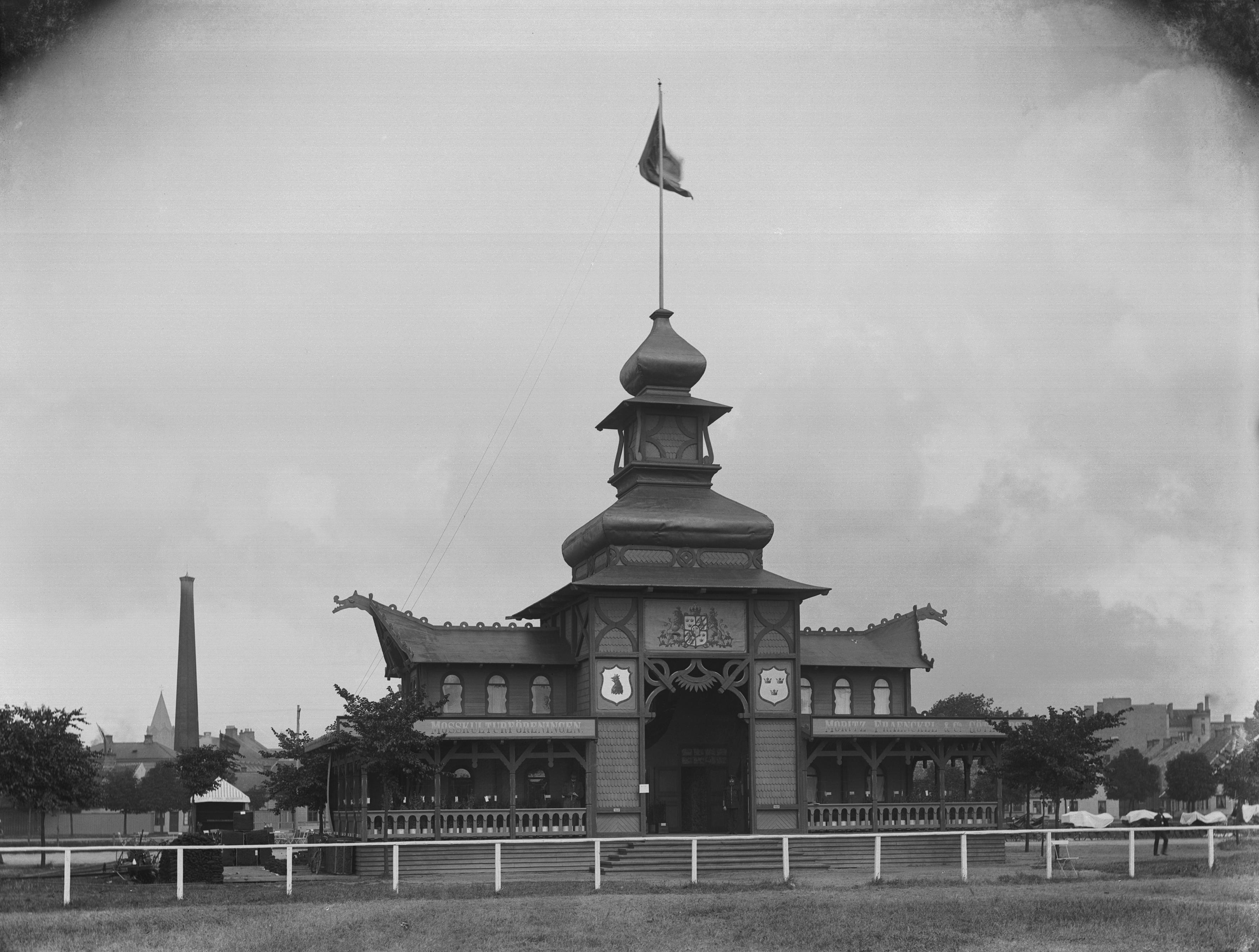Lantbruksmötet i Rörsjöstaden 1896. Parkpaviljong av kinesisk karaktär. Utställare: eventuellt Mosskulturföreingen, Moritz Fraenkel & Co, Göteborg.