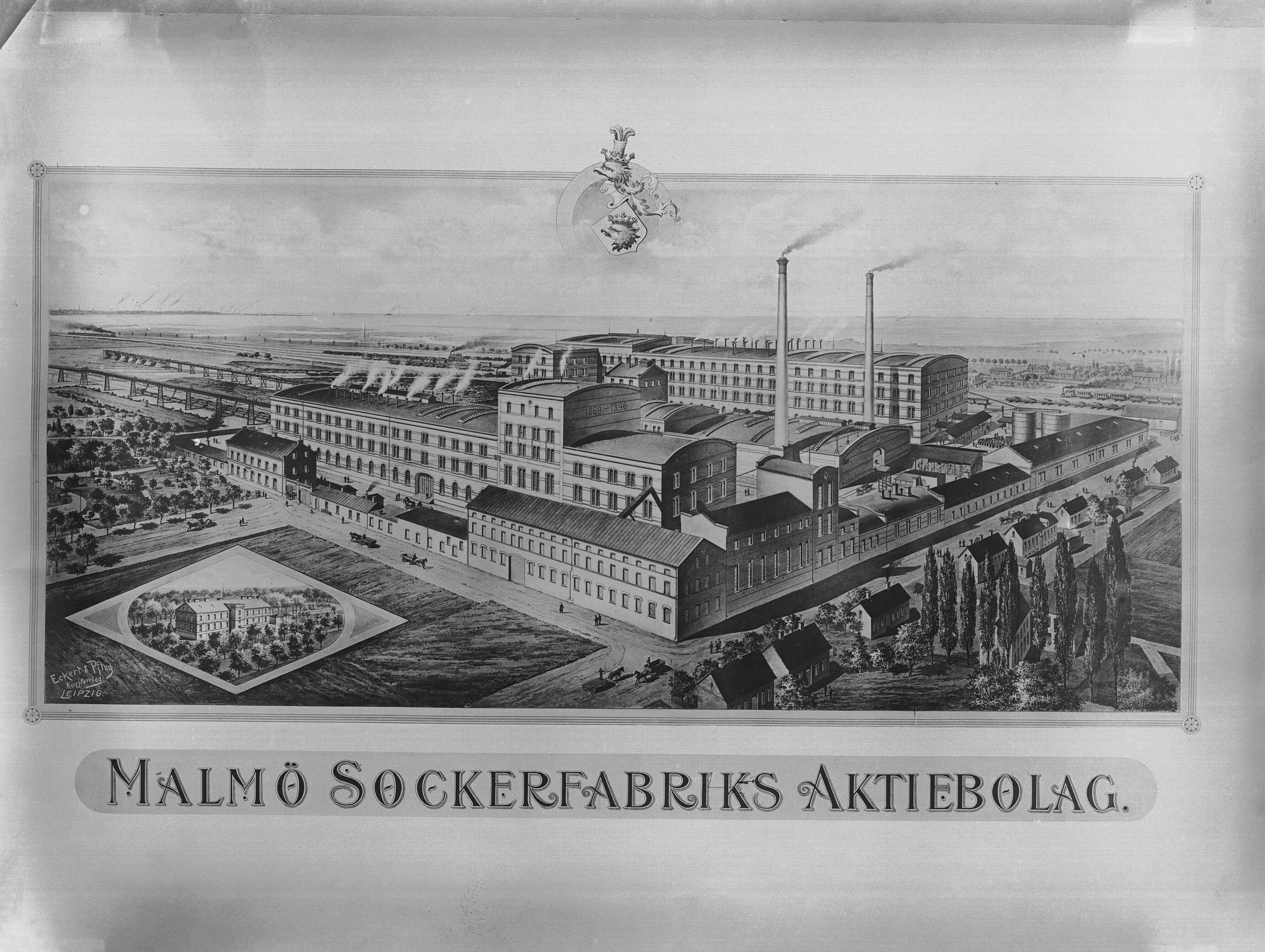 Arlövs sockerfabrik. Vy över sockerfabriken av Eckert & Pflug Kunstverlag Leipzig.