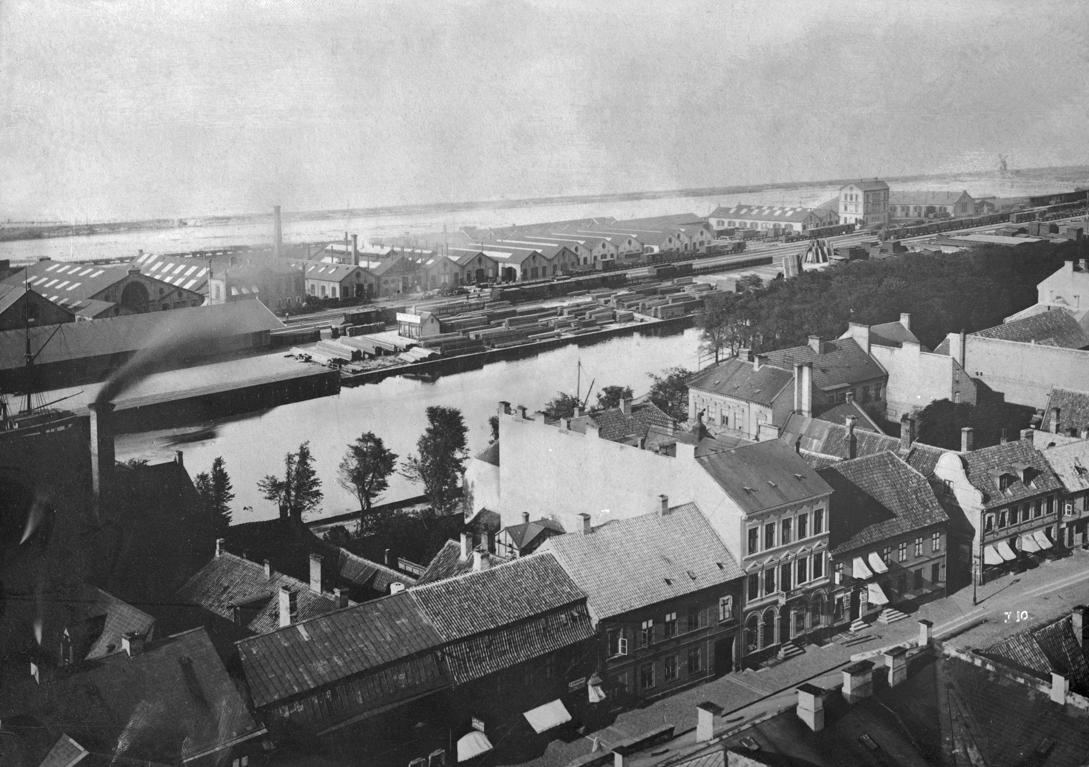 Översiktsvy från S:t Petri kyrktorn med utsikt över Östergatan och järnvägsområdet med verkstäderna. 1870-talet.
